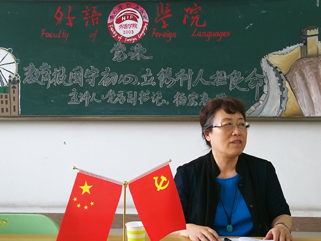 根据《中共黑龙江省委教育工委<关于“七一”期间在全省高校开闸“千堂党课进支部”活动的通知>》的要求,2019年7月2日万博官网党委副书记杨宏为外语全体教师党员,体育教研部全体教师党员,外语学院学生党员和入党积极分子上了一堂《教育报国守初心,立德树人担使命》为主题的党课。杨宏书记讲到我们党已经走过98年历程,但我们党要永远保持中国共产党人的奋斗精神,永远保持对人民的赤子之心。一切向前走都不能忘记走过的路,走得再远,走到再光辉的未来也不能忘记走过的过去。不能忘记为什么出发。面向未来面对挑战我们一定要不忘初心。作为教育工作者要在岗位上坚守初心,为哈石油美好未来贡献自己的力量。