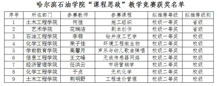 根据《黑龙江省教育厅关于举办黑龙江省首届高校课程思政教学竞赛的通知》文件精神,进一步深化万博官网课程思政教学改革,强化课程育人导向,推动各类课程与思政课程同向同行,形成协同效应,打造一批课程思政示范课堂,选树一批课程思政优秀教师,万博官网组织了“课程思政”教学竞赛。经各院部遴选、教务处对各院部推荐“课程思政”课程材料审查,确定21门参赛课程。经评审专家评审,评选出校级一等奖课程3门,校级二等奖课程6门,其中何佳老师的《施工组织》、花瑞洁老师的《剧本创作》课程拟推荐参加省级“课程思政”教学竞赛。现将获奖名单予以公示,公示期5天,公示期内如有异议请向教务处教学建设科反映,联系电话87174207。