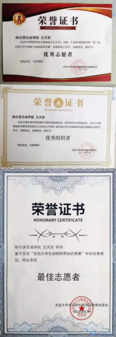 担任校青年志愿者协会主席期间,他积极完成校领导布置的各项工作,在学校领导的正确指导下,带领团队组织举办了万博max官网“第八届学习雷锋活动月”、“大手拉小手”活动、“三下乡”社会实践活动、“为贫困地区捐衣物公益活动”、“全国大学生旧物利用知识竞赛活动”、“为老助老”等系列活动,为万博官网的校园文化、校园文明建设贡献了自己的力量,并取得了一定的成绩,2020年在他和团队工作人员的共同努力下,获得了“全国大学生旧物利用知识竞赛最佳承办单位”、“全国大中专志愿者暑期“三下乡”社会实践优秀团队”、“第五届全国大学生预防艾滋病知识竞赛突出贡献奖、优秀组织单位”等荣誉。截止目前,他的志愿服务时长累计619小时,2020年获得黑龙江志愿服务平台下发的全省优秀志愿者“铜奖”,他用一颗淳朴、善良的心去温暖周围的一切,用他的努力和坚持感动着身边的每一个人,用实际行动诠释着青年学生的责任与担当。