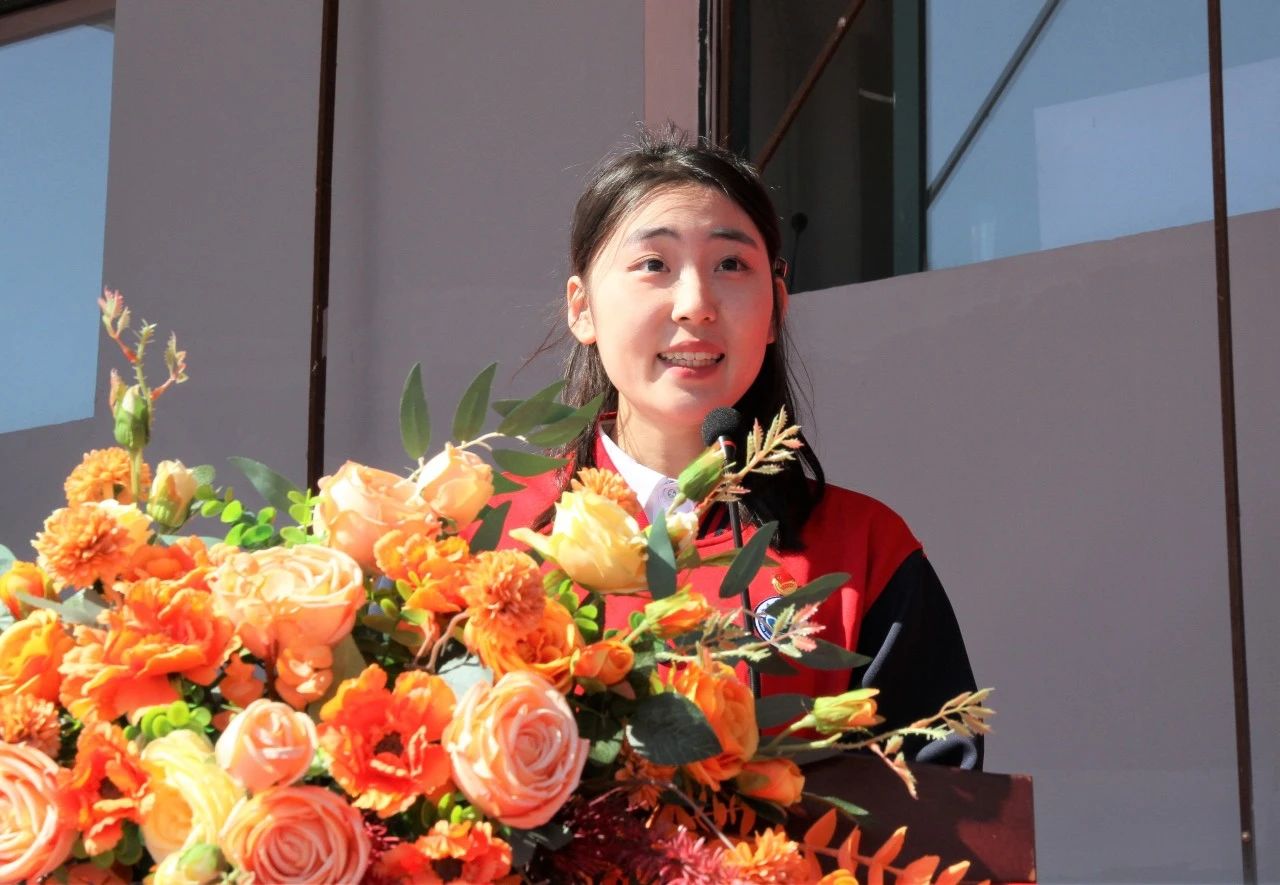 艺术与教育学院2021级王宝佳代表在校生发言。她分享了自己在哈油求学的难忘时光,并表示会将青春“小我”融入祖国“大我”,把树立正确的理想、坚定的信念作为立身之本,努力成长为党、国家和人民所期盼的有志青年。