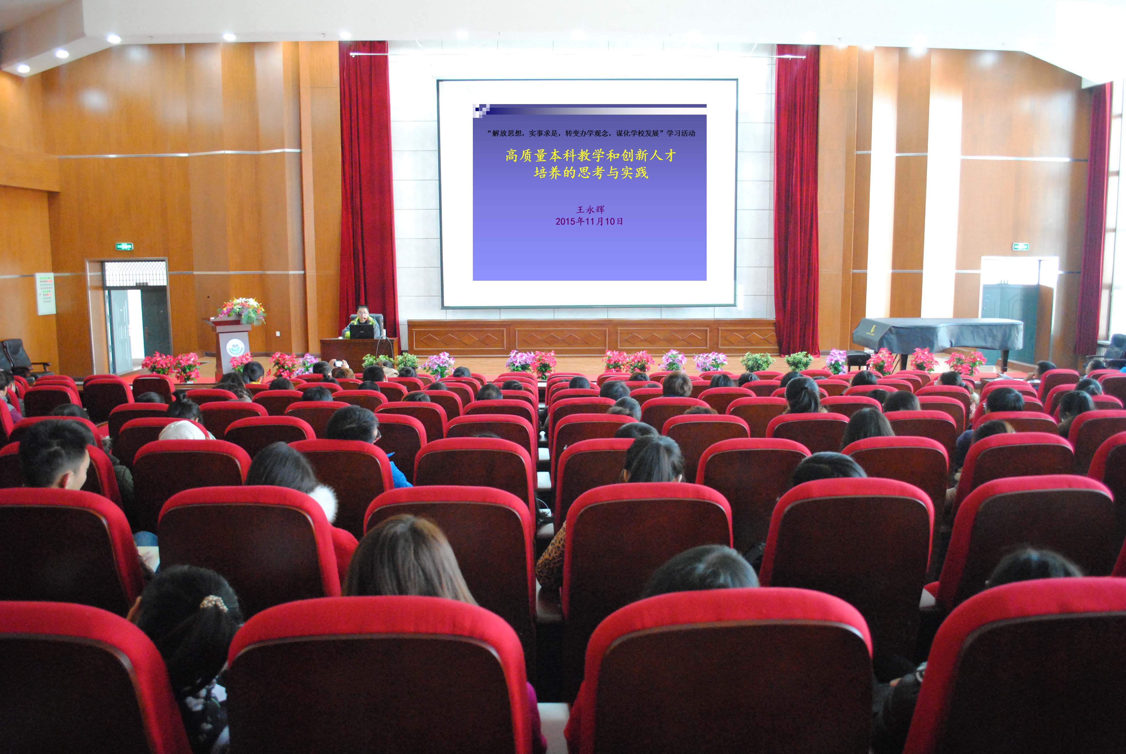 学校于2015年11月10日13:00在图书馆报告厅举行举行了全体教师参加的题为“高质量本科教学和创新人才培养的思考与实践”报告会,本次报告会是围绕学校开展“解放思想,实事求是,转变办学观念,谋化学校发展”学习讨论活动而组织的一次集体学习活动,由教务处副处长王永辉主讲。