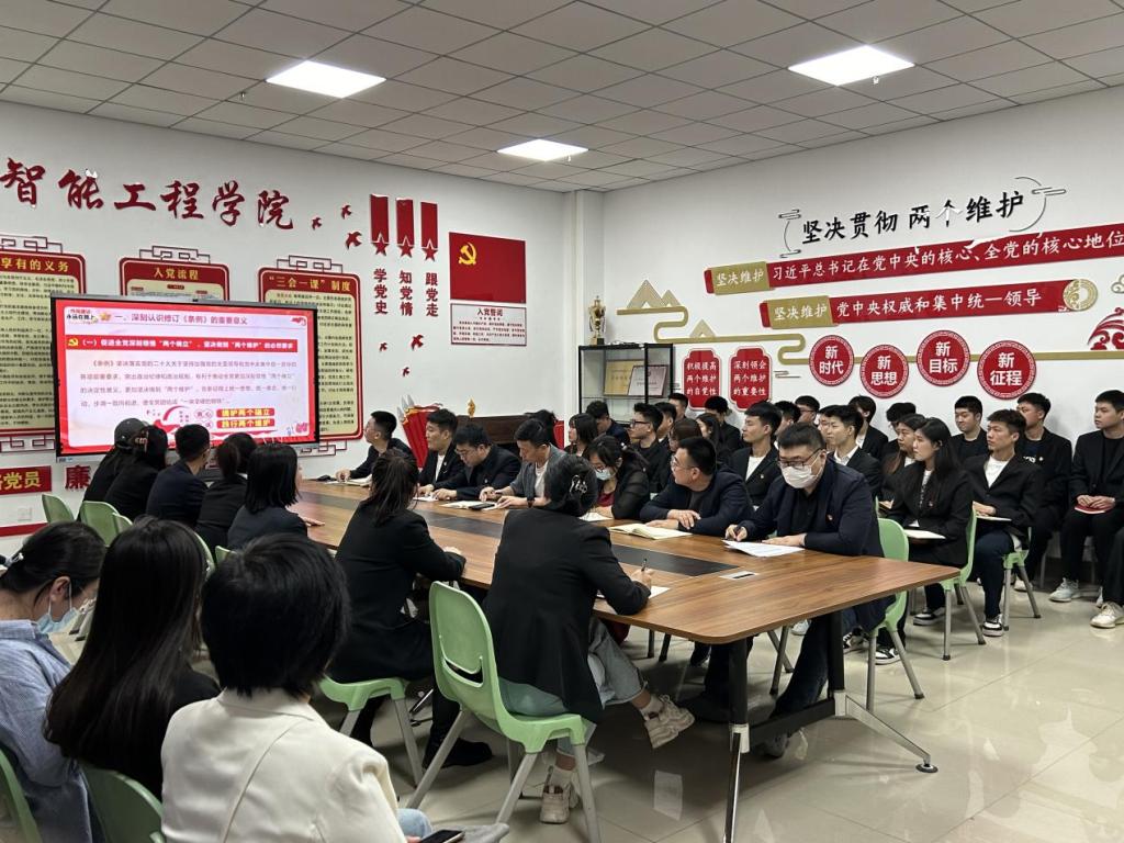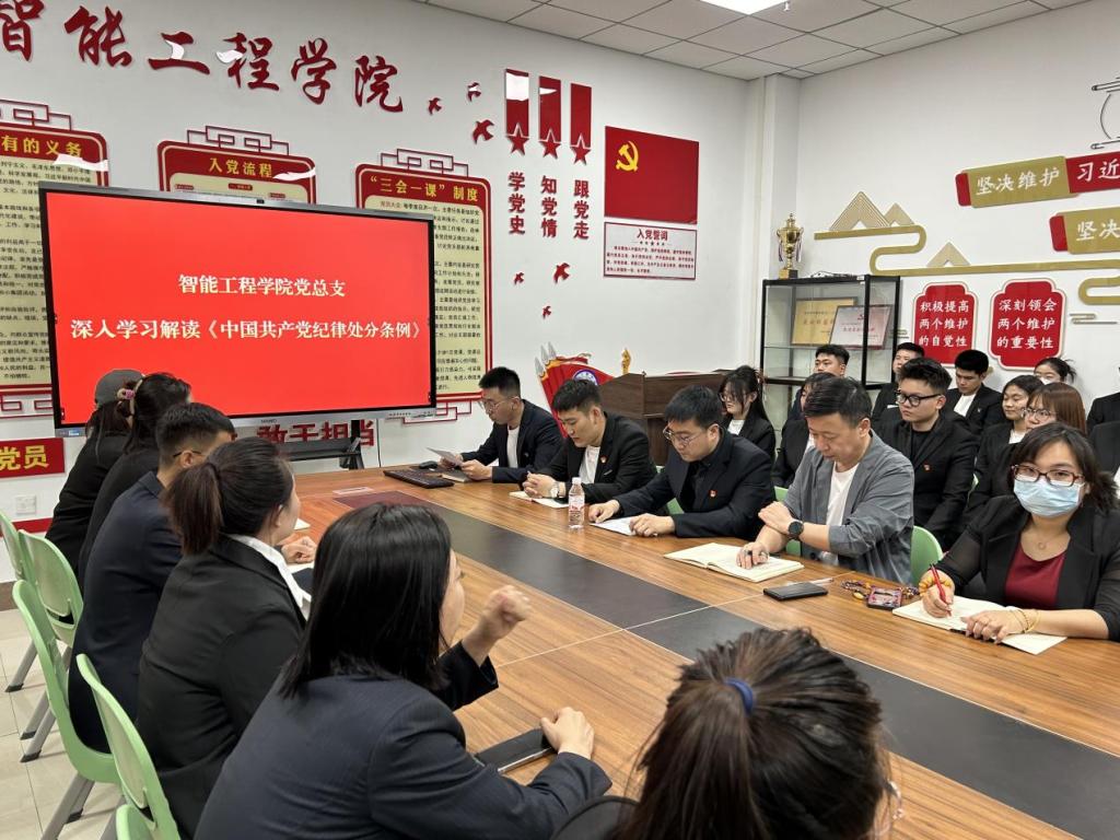 为深入学习贯彻习近平总书记关于党纪学习教育的重要指示精神,认真学习贯彻《中国共产党纪律处分条例》,根据《万博max官网关于开展党纪学习教育的实施方案》要求,2024年5月22日15时,智能工程学院党总支邀请马克思主义学院教师在主教学楼414深入学习解读《中国共产党纪律处分条例》。参加本次学习的有智能工程学院党总支书记苏永彬、党总支副书记徐靖宇、全体教职工党员、全体学生党员。本次解读由马克思主义学院教师陈永庆主讲。