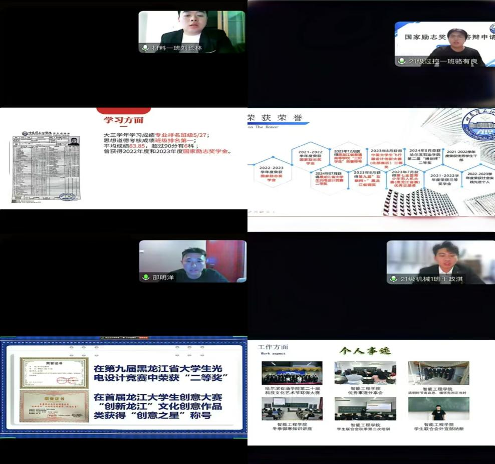 我院本次国家励志奖学金评选,在学生本人提出申请、班级小组评议、辅导员进行初步审查后,共有68名学生参加此次答辩会。每位学生利用3分钟的PPT展示,围绕思想政治、专业学习、学科竞赛、创新创业、学业成果、社会实践、志愿服务及综合表现等做全面的介绍汇报。本次参与答辩的学生们所展现出的卓越成绩和荣誉,充分体现了智能工程学院学子在德、智、体、美、劳各方面全面发展的精神风貌。