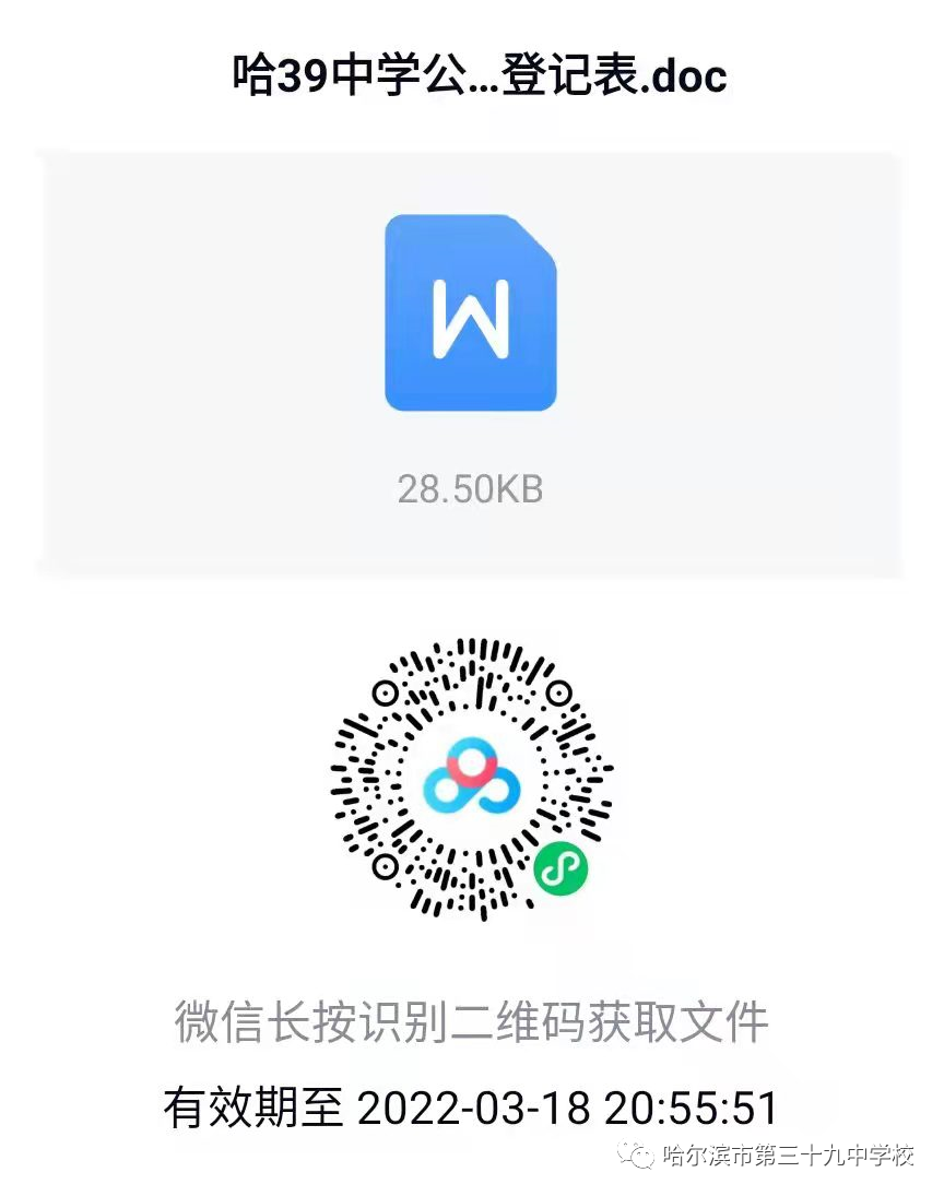 1.个人申请报名。报名采取网上报名方式,报名者扫描下方二维码下载并填写《哈尔滨市39中学校招聘临时聘用教师报名登记表》(以下简称《报名登记表》),并将此表与身份证、学历证书、学位证书、教师资格证照片上传至ha39zhongxue@163.com邮箱。