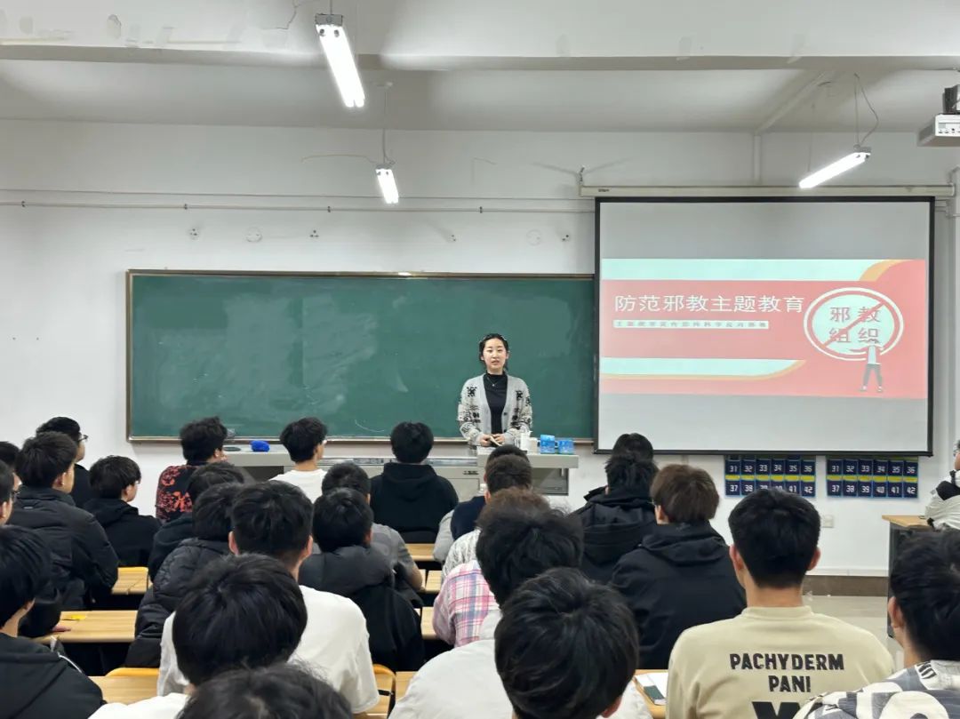 各年级辅导员在授课前进行了认真备课和集体研讨,力争为学生系好反邪教第一粒纽扣,筑牢学生思想防线。在授课过程中,辅导员们用通俗易懂的语言向学生详细讲解邪教的种类、特征、社会的危害性等方面的内容。并通过典型的案例,讲述了邪教和宗教的本质区别,深刻揭露邪教组织“反人类、反科学、反社会”的本质,揭示了邪教的危害和骗人手段。
