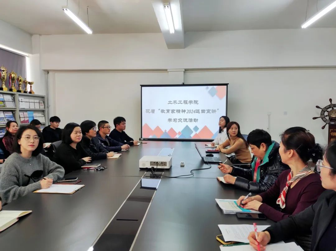 为推广优秀教师的教育教学经验,激发教师们的职业热情和教育事业的热情,2024年3月5日下午,土木工程学院组织全院教师观看“教育家精神2024巡回宣讲活动”,深刻体会到宣讲团成员用实际行动诠释了教育家精神的深刻内涵,并以座谈的形式开展了学习心得交流。