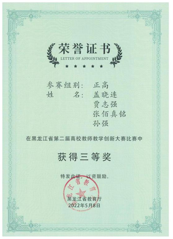 近日,我院盖晓连院长带领的教学团队荣获第二届黑龙江省高校教师教学创新大赛三等奖。