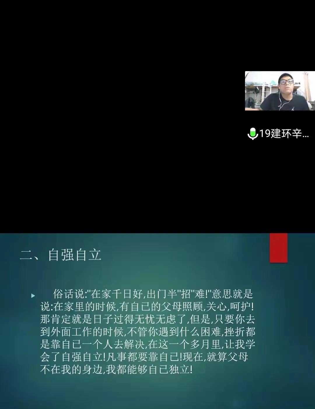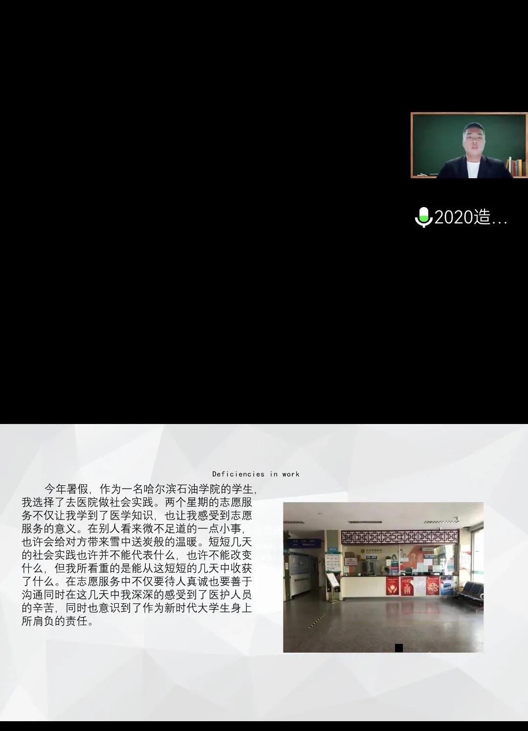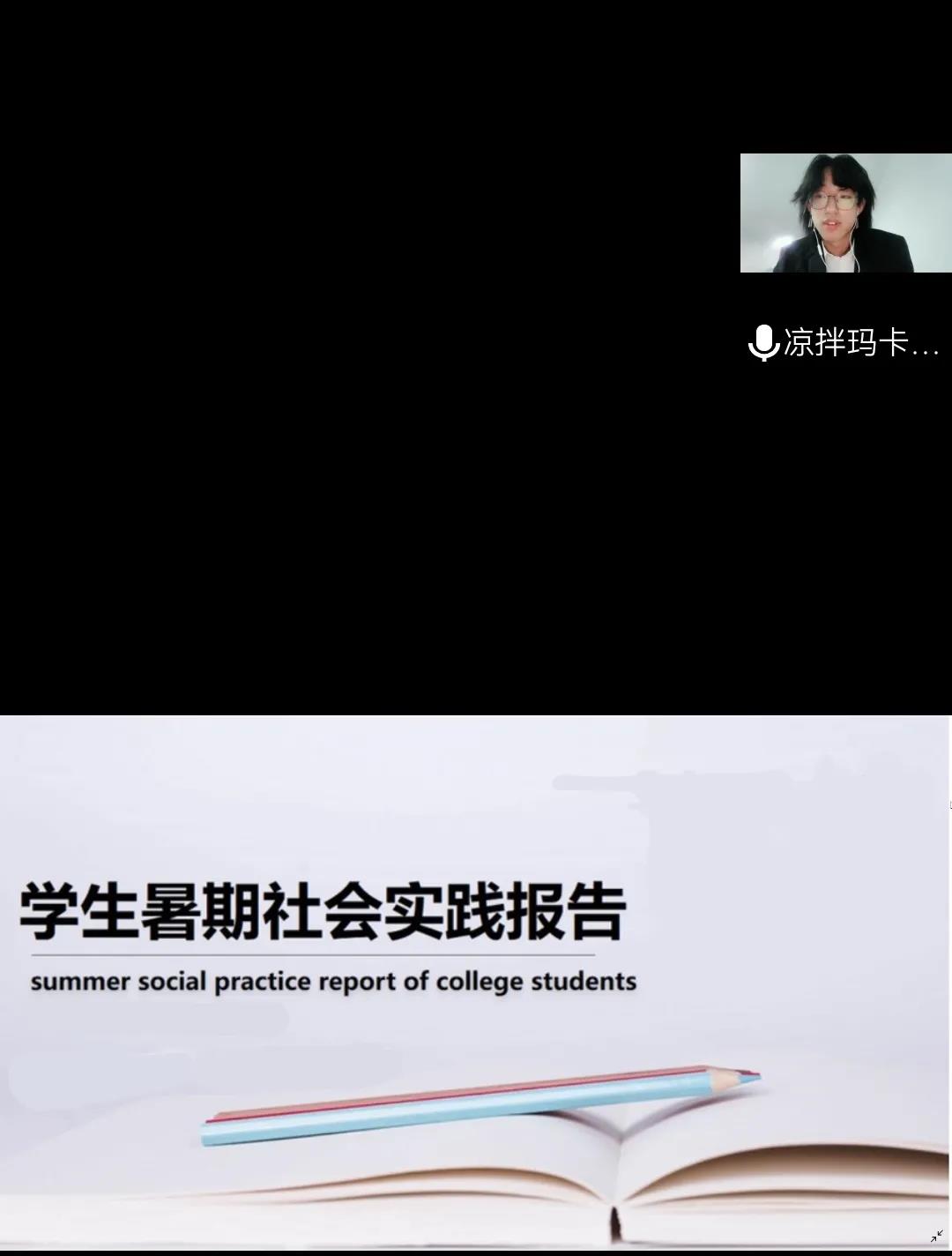 土木工程学院大学生暑期社会实践报告会于10月14日晚五点半在腾讯会议召开,在本次会议中,来自各个年级的代表通过PPT展示,分享了实践活动的收获和成果,这些优秀的同学回顾了暑期精彩的社会实践生活,分享见闻和所感所得,向大家讲述自己在活动中的故事,同时号召同学们积极参加暑期社会实践活动。最后评奖出李佳琪、宋浩楠 、姜曼、 王亚杰、 孟祥雨五人为社会实践先进个人。