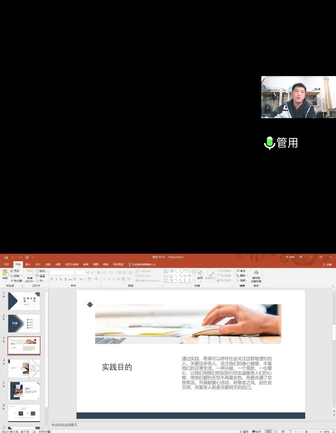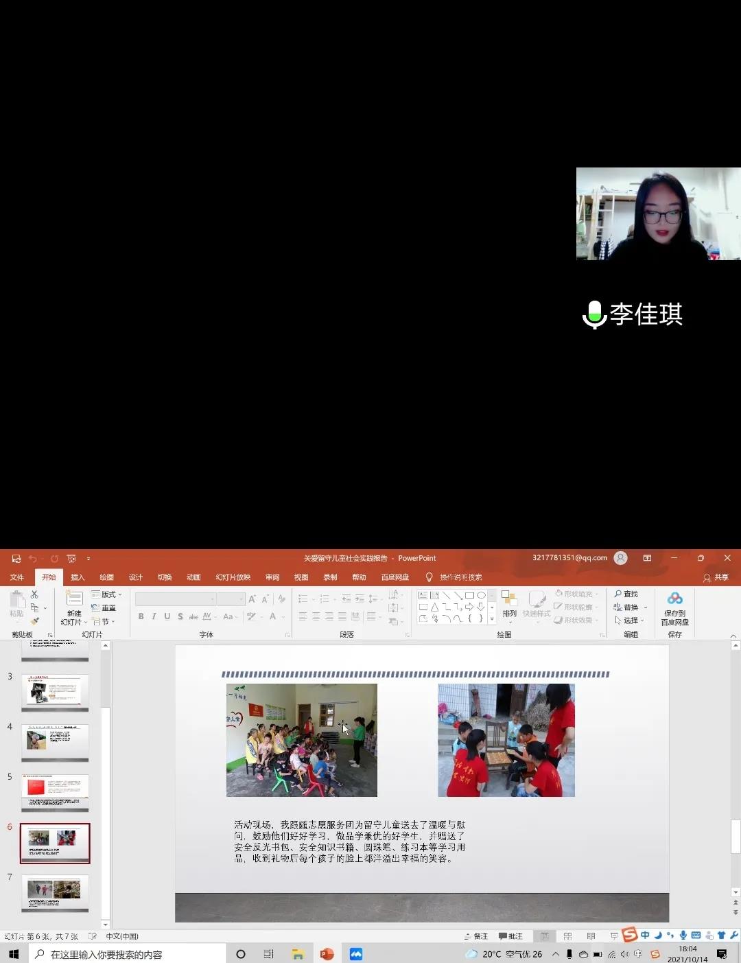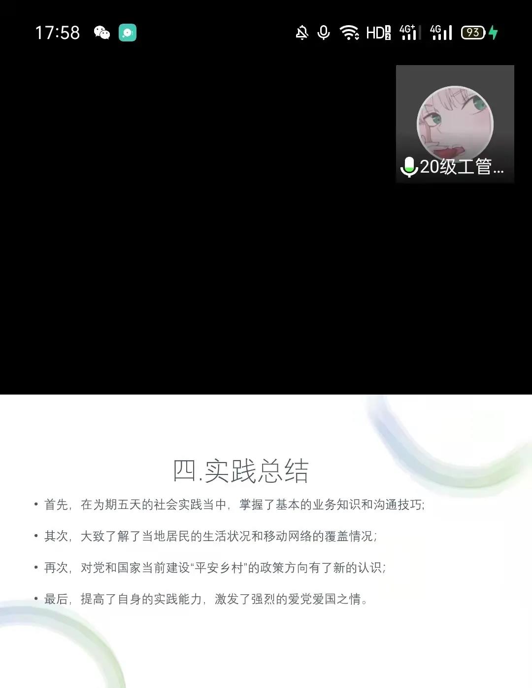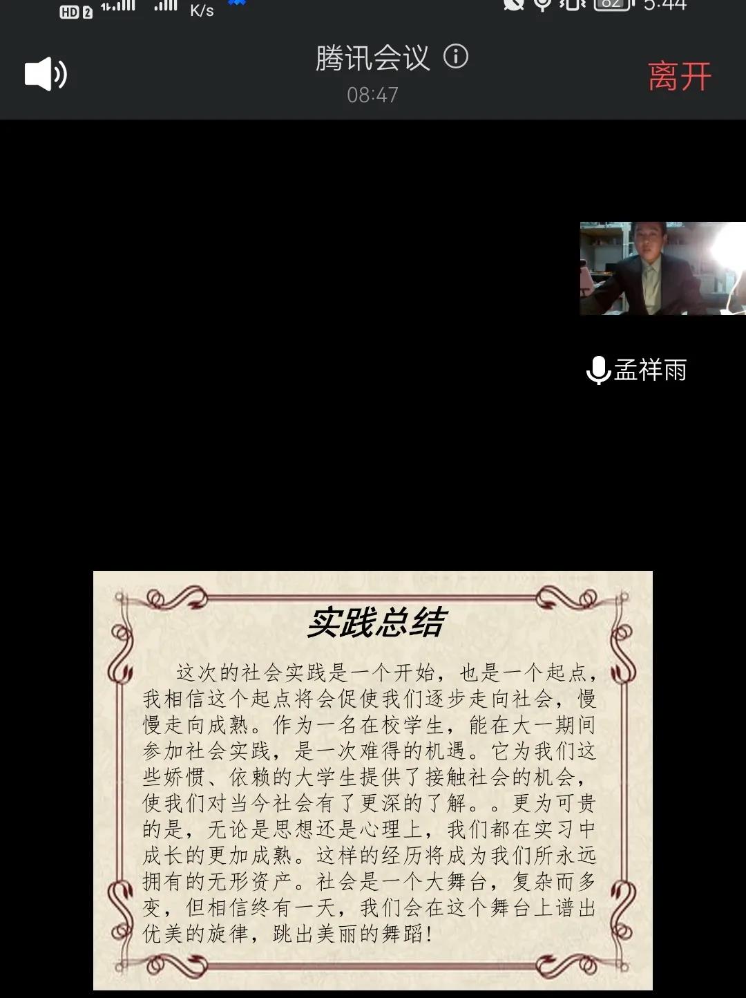 土木工程学院大学生暑期社会实践报告会于10月14日晚五点半在腾讯会议召开,在本次会议中,来自各个年级的代表通过PPT展示,分享了实践活动的收获和成果,这些优秀的同学回顾了暑期精彩的社会实践生活,分享见闻和所感所得,向大家讲述自己在活动中的故事,同时号召同学们积极参加暑期社会实践活动。最后评奖出李佳琪、宋浩楠 、姜曼、 王亚杰、 孟祥雨五人为社会实践先进个人。