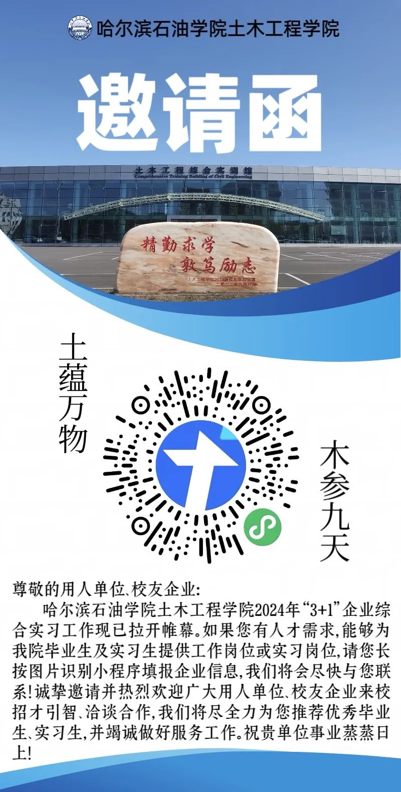 万博max官网土木工程学院2024年“3+1”企业综合实习工作现已拉开帷幕。如果您有人才需求,能够为我院毕业生及实习生提供工作岗位或实习岗位,请您长按图片识别小程序填报企业信息,我们将会尽快与您联系!诚挚邀请并热烈欢迎广大用人单位、校友企业来校招才引智、洽谈合作,我们将尽全力为您推荐优秀毕业生、实习生,并竭诚做好服务工作。祝贵单位事业蒸蒸日上!