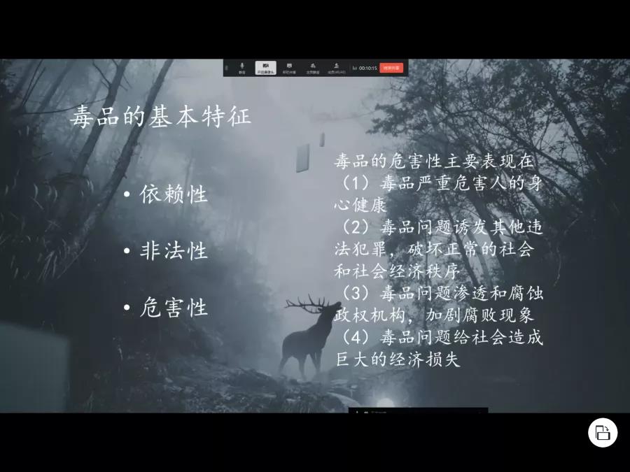 各班级通过腾讯会议和钉钉视频进行线上班会。同学们纷纷在弹幕里和钉钉群里进行互动发表感言。班会主要通过以下几部分的内容向同学们宣传禁毒教育:一、毒品的定义和种类。二、毒品的基本特性。三、毒品的传播途径;四、毒品会引起哪些疾病感染和传播。五、禁毒宣传视频。六、毒品和禁毒教育相关知识竞答。七、同学代表发言进行禁毒倡议。