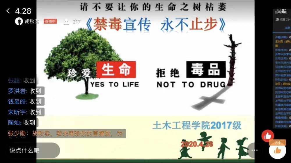 为认真贯彻中央关于禁毒宣传教育工作的重要指示精神,根据校团委《组织开展2020年学校毒品预防教育活动的通知》的文件要求,4月28日-4月30日,土木工程学院2017级辅导员组织2017级全体学生线上开展“珍爱生命、拒绝毒品”为主题的班会,加强学生对毒品传播渠道和场所的认识教育,督促学生在生活中自觉防范,并做到珍爱生命,远离毒品。