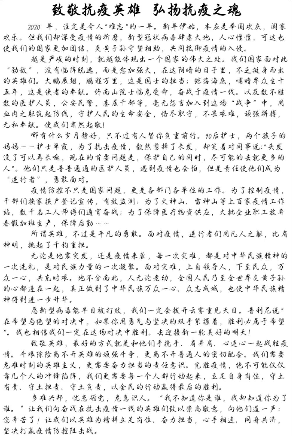 “一个有希望的民族不能没有英雄,一个有前途的国家不能没有先锋。总有那些逆向而行的英雄。”通过这次征文比赛,相信同学们在诵读平凡人不平凡事迹的过程中,深切体会到了新时代青年应有的责任担当,更从中坚定了自身的抗疫信心。疫情终将散去,让我们静待春暖花开!