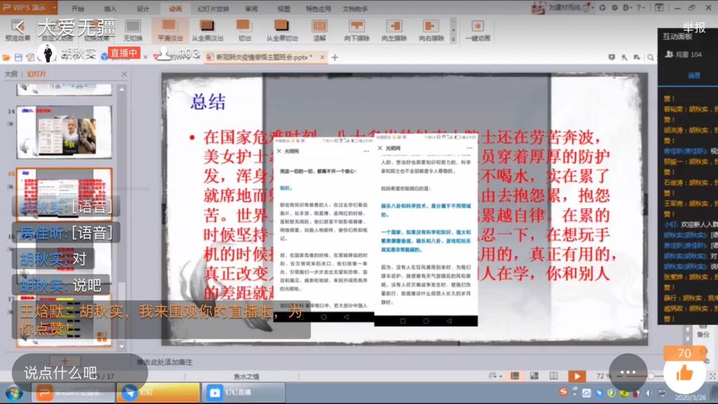 通过这次疫情让全世界看到了中国的强大,也看到了什么是真正的大国风范,同学们为生在这样的国家而骄傲和自豪,表示在这次疫情中他们看到了许多医务人员的牺牲和付出,被深深地感动和鼓舞,希望大家能够珍惜眼前这来之不易的幸福,在战胜疫情的决胜时期,能够继续响应国家各项政策,保护好自己,在以后的日子里更要学会珍惜和感恩。