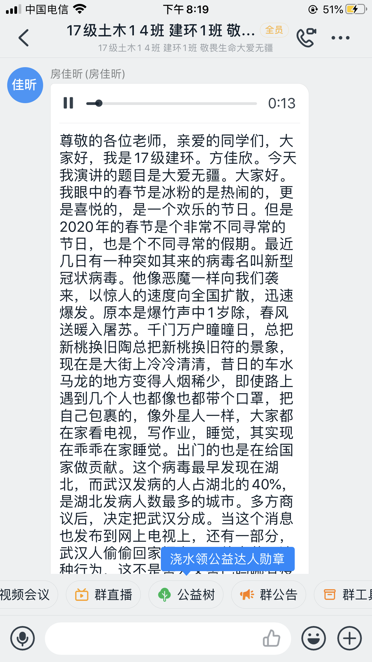 2020年的初春,不同寻常,新冠肺炎的一线抗疫战士给同学们的心中带来了力量和希望,鼓舞着同学们爱护国家,敬畏生命,国难当头,青年有责!