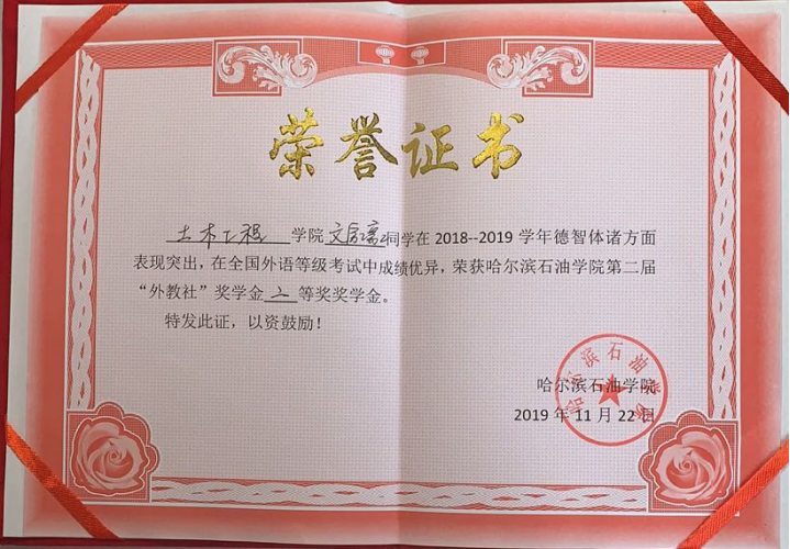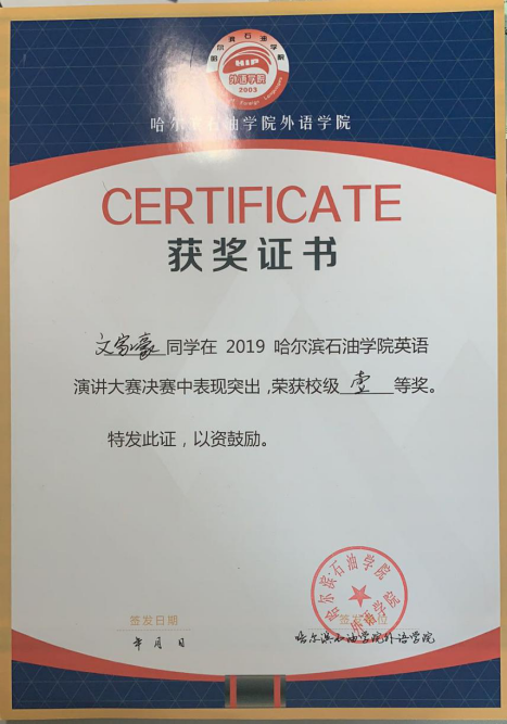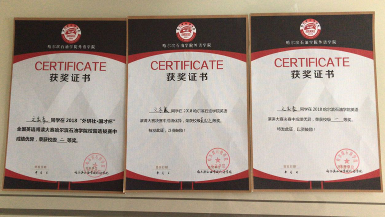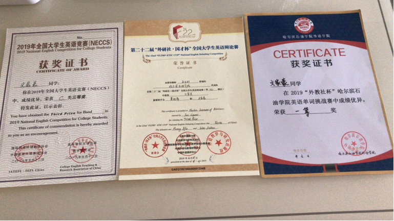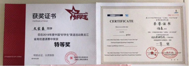 文家豪同学积极参加学校组织的各项活动,尤其是在英语比赛方面,大一一年他收获颇丰,大一上学期分别荣获了外研社演讲比赛一等奖,二十一世纪可口可乐杯校选赛一等奖、黑龙江省三等奖,阅读大赛校级二等奖;在大一下学期,分别荣获了外研社全国大学生英语辩论赛三等奖,全国大学生英语竞赛三等奖,黑龙江省好学生英语赛事活动特等奖,学校单词大赛一等奖;到现在的大二上学期,他又荣获了外研社阅读大赛黑龙江省三等奖和外研社演讲校级一等奖,并获得了万博官网本届外教社二等奖学金。文家豪同学还经常利用自己的空闲时间给其他同学传授学习心得和学习方法,并且多次带领同学参加比赛,目前他正在为组织一支英制辩论赛队伍做准备。
