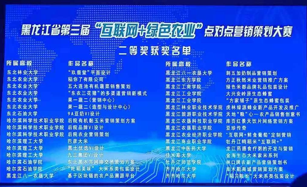 为进一步激发高校师生的创业意愿,提升学生的综合素质与创新创业能力,鼓励大学生了解区域经济发展需要,应用创新创业成果服务乡村振兴战略,助力精准扶贫。黑龙江省教育厅协东北农业大学,于2018年10月8、9两日在东北农业大学举办了黑龙江省第三届“互联+绿色农业”点对点营销策划大赛决赛。比赛项目共分绿色农产品营销“金点子”创意赛、绿色农产品营销挑战赛以及绿色农产品VI设计大赛三项赛事。土木工程学院由荆明野老师指导的学生作品《吃稻美味》绿色农产品VI设计成功入围决赛,经过激烈的角逐荣获二等奖。