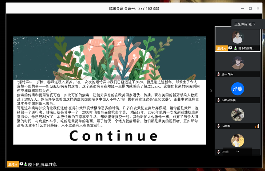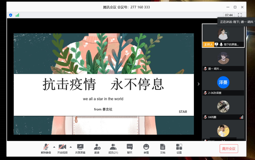 海明威在《老人与海》中有一句话:“所有的意外都是意料之中的事情。”但是我们正在经历的2020年,它所带给我们每一个人,带给我们这个国家,甚至是带给我们这个地球的,恐怕是这些年来最大的意外感。但是“万物皆有裂隙处,那是光漏进来的地方。”庆幸的是,我们的国家成为首个成功战胜这场疫情的国家,为了让同学们更好的认识到这来之不易的胜利,故土木工程学院善言社于5月22日下午5点开展此次疫情演讲活动。