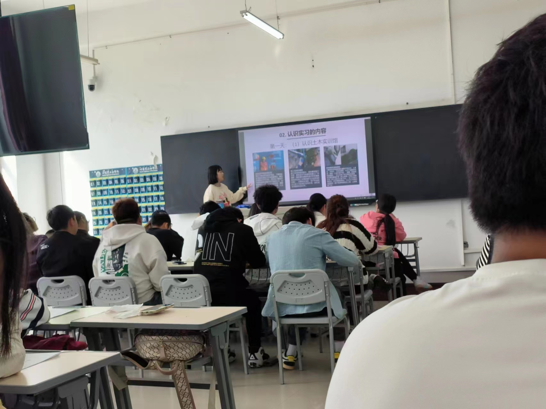 第一天,两位指导教师召开了认识实习动员大会,会上就实习的意义、实习内容、注意事项等进行了讲解。大会结束后,上午带领学生参观土木工程实训馆,老师在讲解过程中,引导学生主动思考、积极提问。学生们对实训馆内的节点布置具有浓厚的兴趣,全程认真听讲、积极记录。最后在实训馆中观看了纪录片“超级工程——港珠澳大桥”,通过纪录片的观看,学生非常震撼,庆幸自己生在中国,能够见证这些工程的建设,为祖国的强大而自豪。