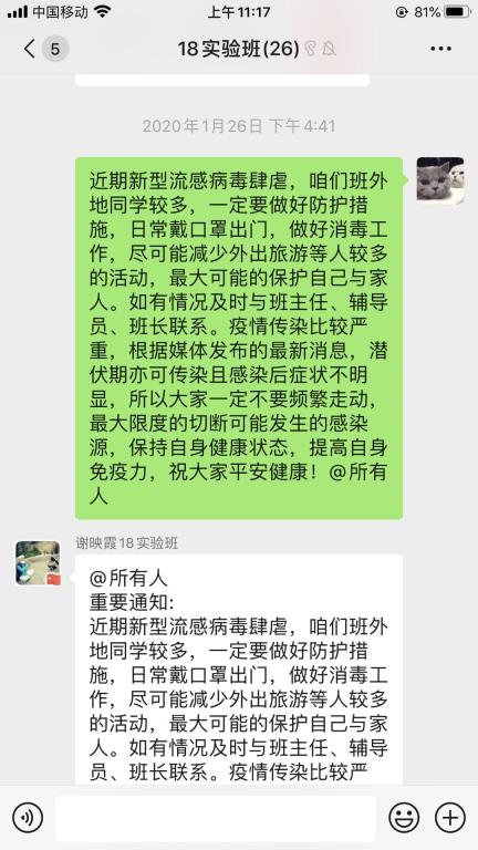 每位班主任教师也时刻关注疫情期间学生们的身心健康,班主任们深入班级微信群、QQ群,安抚学生不安情绪,科普防疫知识,宣传国家防疫管控举措,用爱国主义正能量事迹激励学生牢筑爱国的理想信念,使每位同学坚信国家力量,积极乐观应对疫情。