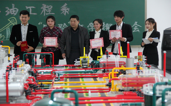 (图为石油工程系金铁钢书记、副主任在为获奖学生发奖)
