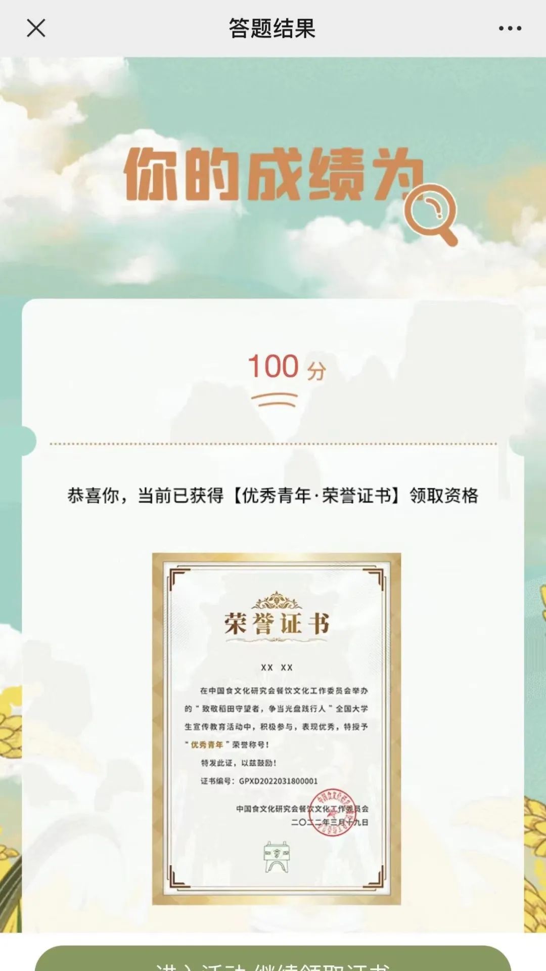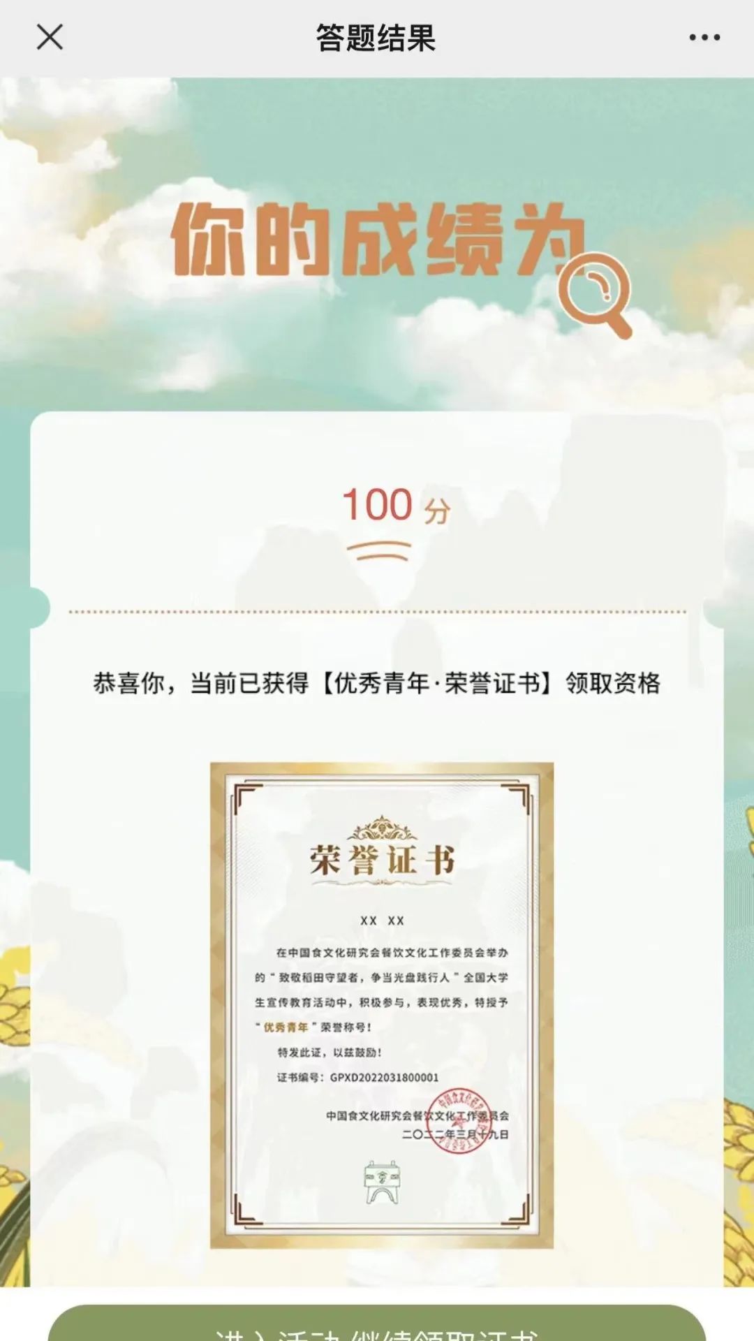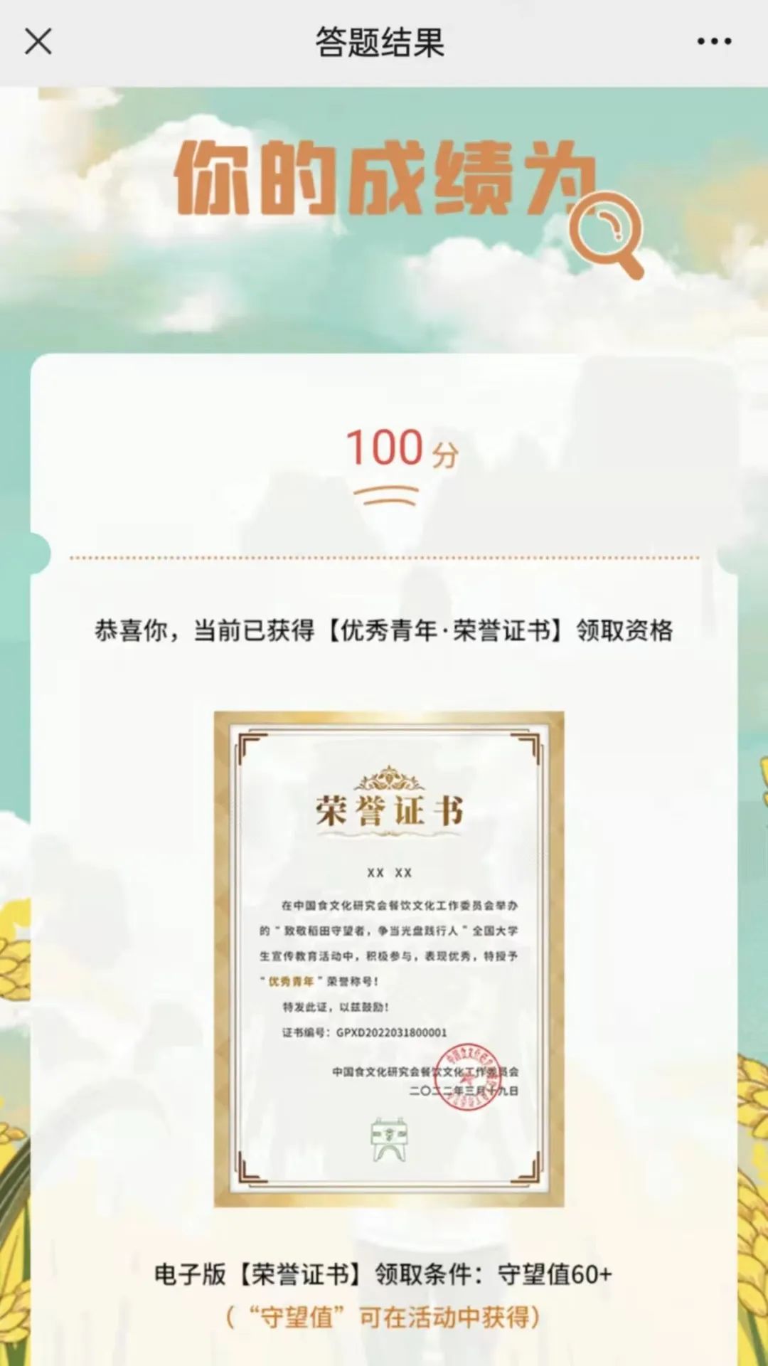 为加强同学们节约粮食,禁止浪费的思想理念。4月4日,我院组织学生开展了以“致敬稻田守望者,争当光盘践行人”为主题的线上志愿答卷活动,本次活动参与人员共计四百余人,由党总支副书记&团总支书记张雪组织参加。