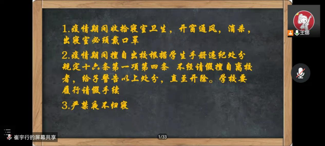 会上系统对学生展开教育,新冠肺炎疫情的复杂性、艰巨性、反复性、长期性。要求学生做好个人防护,讲究个人卫生,戴口罩、不聚集、不参与集体活动,做好自身防护;遵守学校安全规章制度,疫情期间保持寝室卫生,多开窗通风,进行消毒,出寝室必须戴口罩.请假要履行请假手续,严禁夜不归寝。心理有任何困惑要及时联系辅导员,在寝室要注意寝室关系,要与室友和睦相处,不能聚众赌博,不能在寝室喝酒,不能打架斗殴。对于外来的快递要及时进行消杀,要准时上课,保持手机通信畅通,如果体温异常要及时向辅导员报备。
