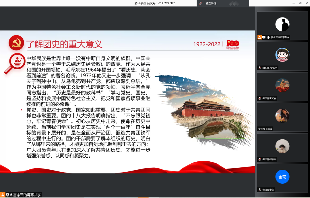 活动中,从团的百年历史进程、了解团史的重大意义、团的百年光辉给我们的深刻启示、如何做好党的后备军四个阶段回顾了共青团的发展历程,让同学们感受到共青团的发展紧跟党的步伐,积极地进行革命和建设。为适应革命斗争的需要,共青团的名称几经变更,从中国社会主义青年团到中国新民主主义青年团,到最终的中国共产主义青年团。在团的光辉历史中,同学们也了解到了党对共青团的坚强领导,党的先进指导思想也不断地被写入团章,党和人民百年奋斗,书写了中华民族历史上最恢宏的史诗。