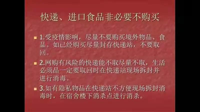 会上,各年级辅导员传达了关于疫情防控快递消杀的有关注意事项,引导学生在取件时按照防疫要求做好个人安全防护、有序排队、在取件处拆封快递,落实疫情防控各项措施,为引导学生切实做好常态化疫情防控下的快递收发安全保障工作贡献力量。随后,就进一步做好疫情防控工作提出五点要求:一、疫情防控期间,尽量做到非必要不网购。二、网购前明确发货地,不在中高风险地区购买任何产品。三、收发快递时要错时错峰,做好适度防护,扫码、戴口罩、手套,人员保持一米距离。四、在拆解外包装和内包装过程中注意个人防护,尽量在户外完成,外包装拆除后不带入宿舍或室内。五、做好个人手部和接触部位的清洗,减少拆除包装后手部和其他部位及生活设施的接触。