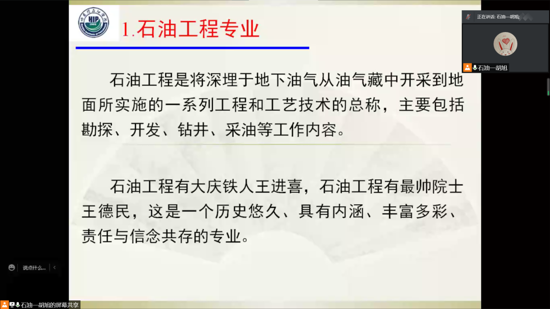 为了增强新生对所在专业的了解,明晰未来的学习目标,提升专业认同感。我院于11月14日上午10点在腾讯会议召开石油工程专业介绍会。会议由石油工程系主任胡旭主讲,21级石油工程专业全体学生参加。