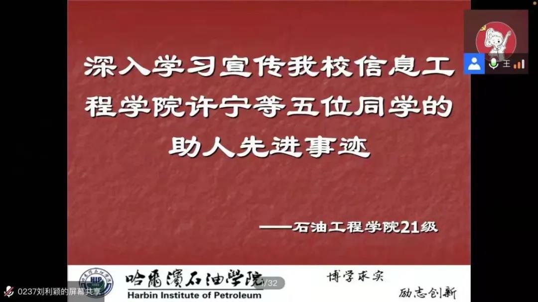 为了增强同学们助人为乐的意识,形成一种积极的自我意识,我院于11月6日晚18时30分于腾讯会议举办“深入学习宣传万博官网信息工程学院许宁等五位同学的助人先进事迹”。石油工程学院21级全体同学参加此次会议。会议由2021级辅导员助理王娜老师主持。