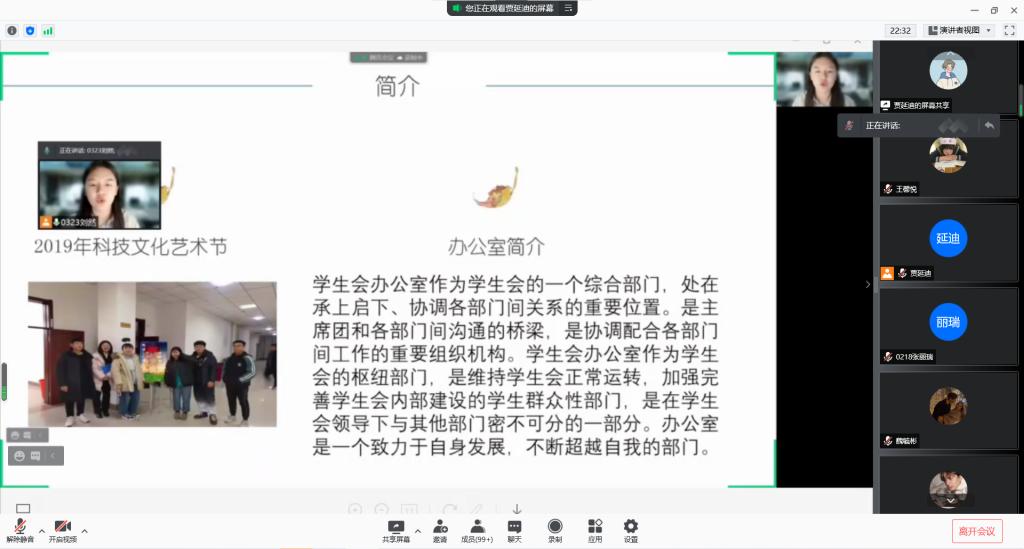 会上,学生会主席魏毓彬简要介绍了学生会整体架构及部门概况。随后,各部门负责人依次向大家介绍了各组织的基本情况、部门组成及日常工作,分别对各部门工作职责、部门职能及纳新要求做出详细讲解,他们生动形象、各具风格的独特讲解,给新生们留下了深刻印象。使广大新生对我院学生会组织充满憧憬和向往。最后,各位学长学姐也为新生献上美好的祝愿,愿大家能踊跃报名,积极参与到各组织中,共同为我院发展贡献力量。