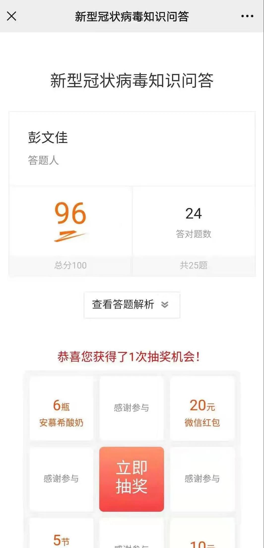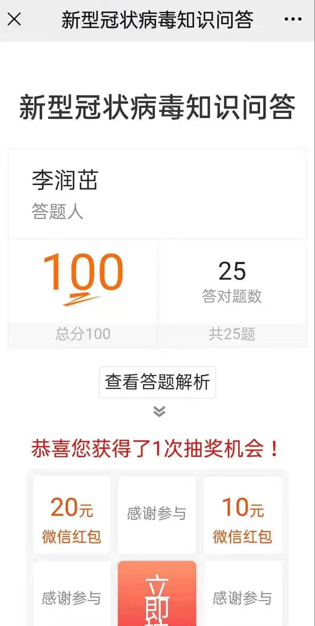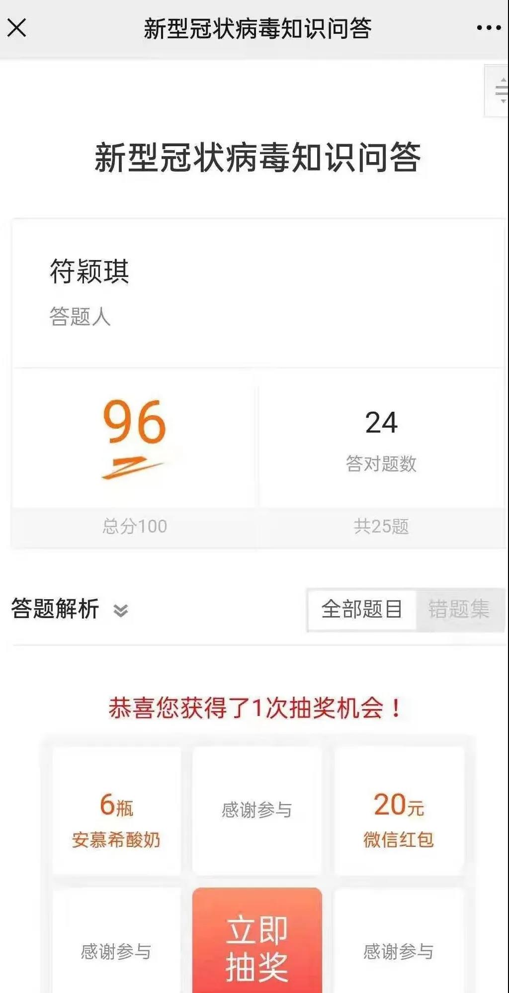 本次知识竞赛精选了25道新型冠状病毒肺炎的相关知识,内容包含了新型冠状病毒的特征、病毒来源、传播途径和防护方法等,多方面考察了学生对疫情防控的了解情况,增强了同学们对新型冠状病毒肺炎的防控意识,从思想上凝聚同学们的抗疫力量,为这场疫情防控阻击战提供了有利的知识武器。
