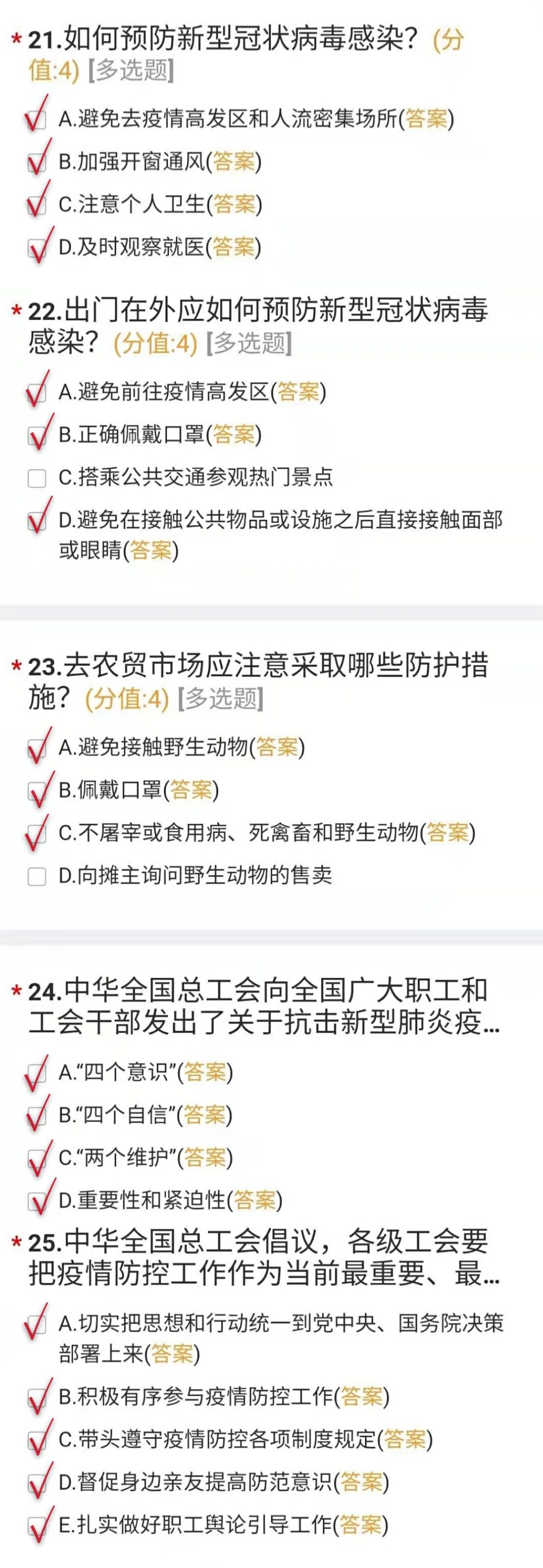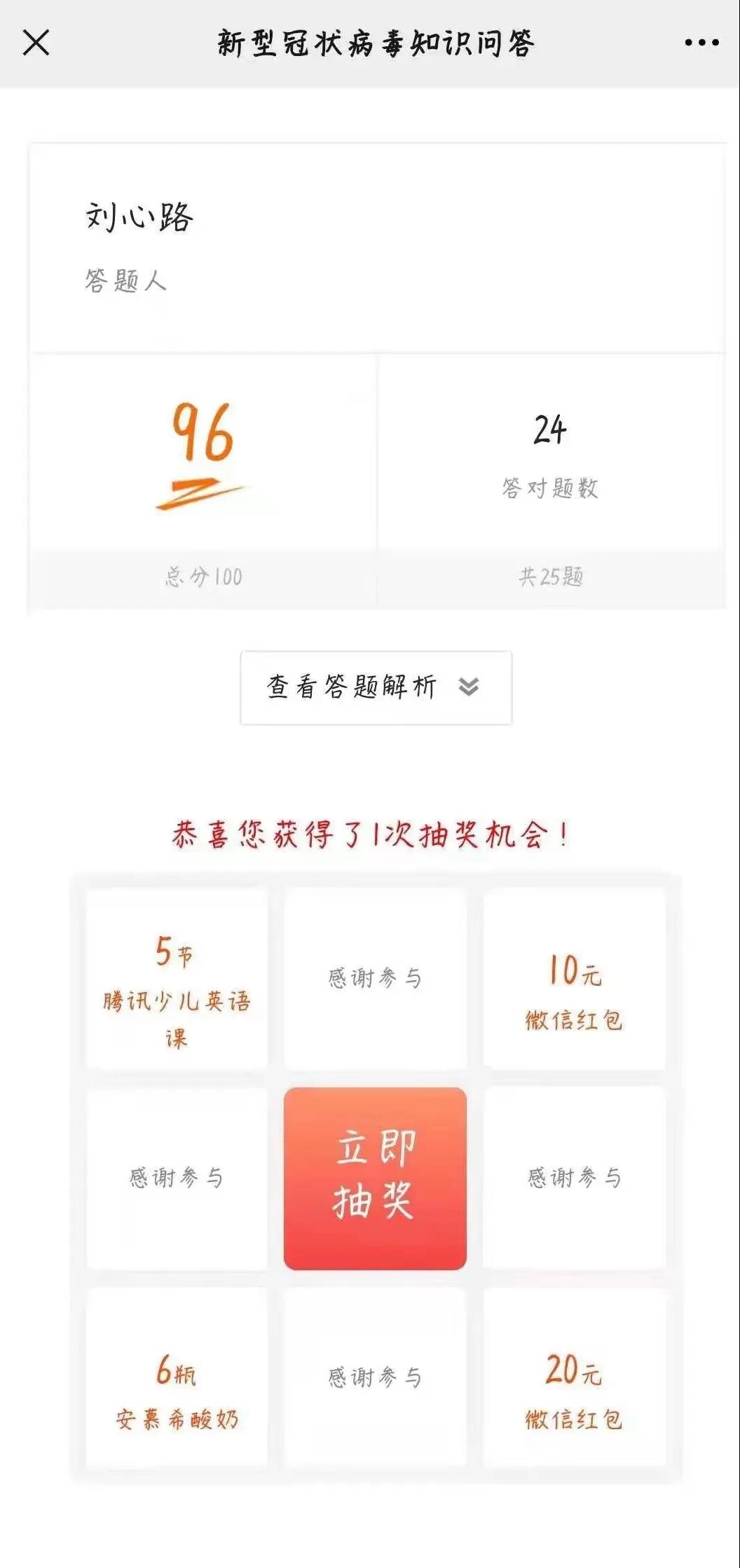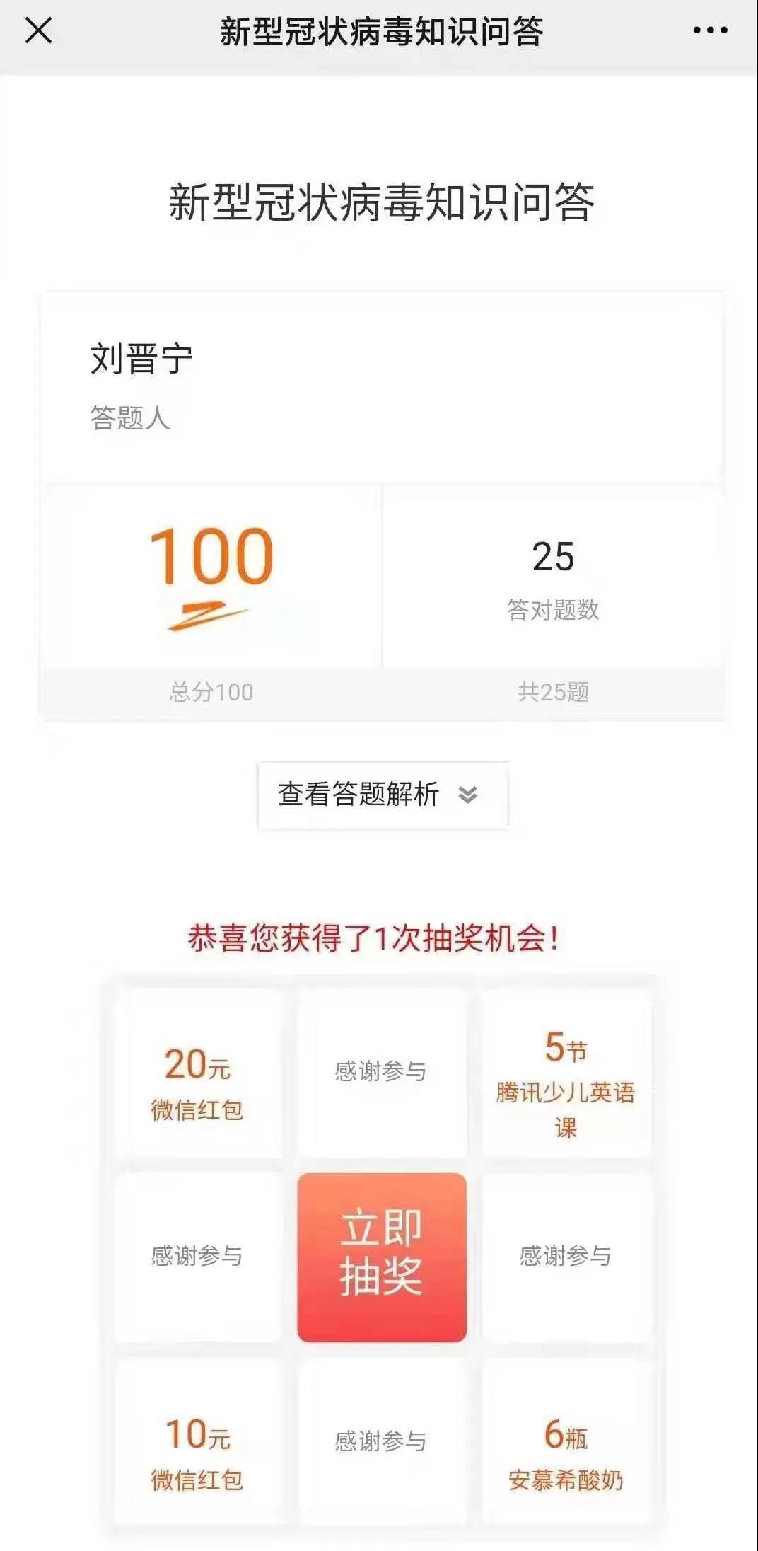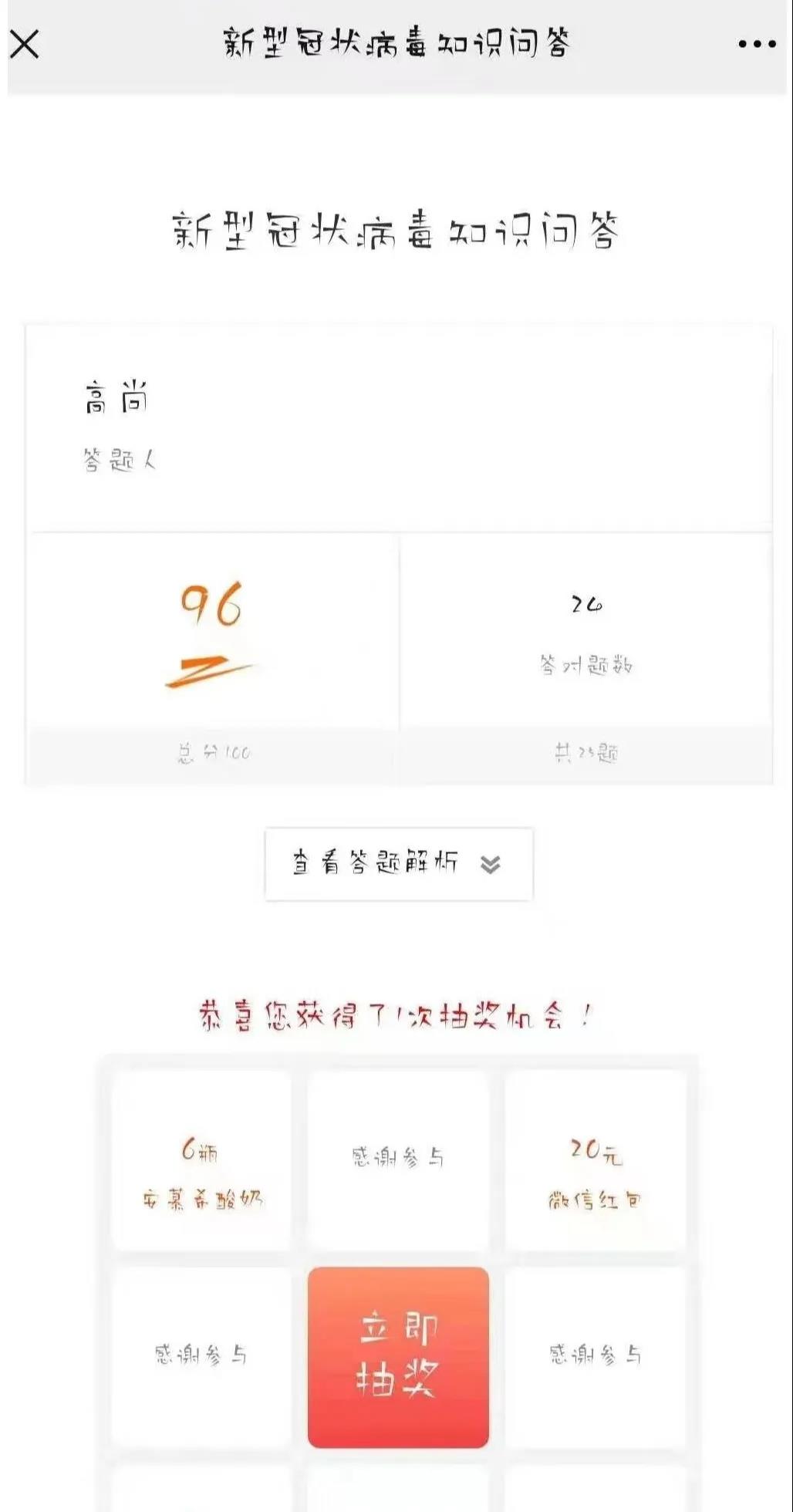 本次知识竞赛精选了25道新型冠状病毒肺炎的相关知识,内容包含了新型冠状病毒的特征、病毒来源、传播途径和防护方法等,多方面考察了学生对疫情防控的了解情况,增强了同学们对新型冠状病毒肺炎的防控意识,从思想上凝聚同学们的抗疫力量,为这场疫情防控阻击战提供了有利的知识武器。