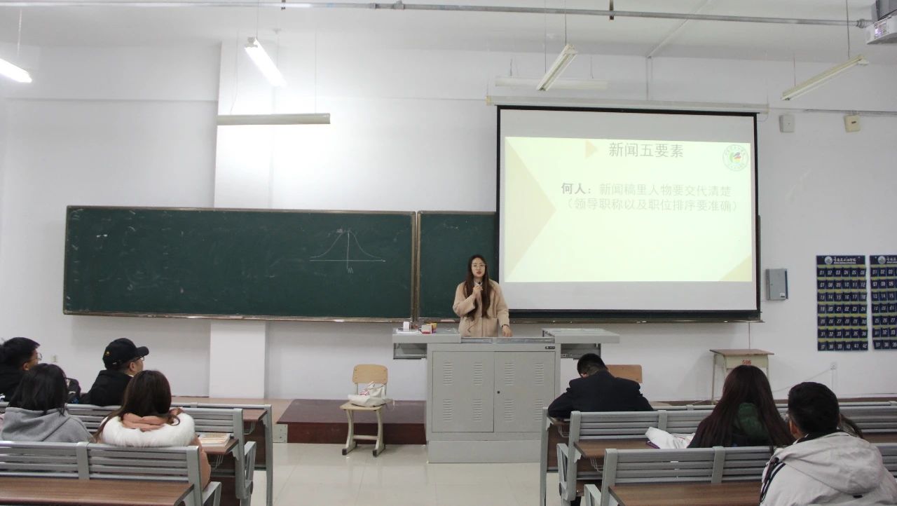 为进一步提高我院学生干部对基本写作的了解,调动同学们对学院宣传建设的积极性。10月28日晚5:30,我院于主教426教室开展以“开拓思维,博闻强识”为主题的基本应用能力写作提升培训会。我院党总支书记刘雁春及各年级全体学生干部参加本次会议。会议由我院分团委新闻部部长李恩红担任主讲人。