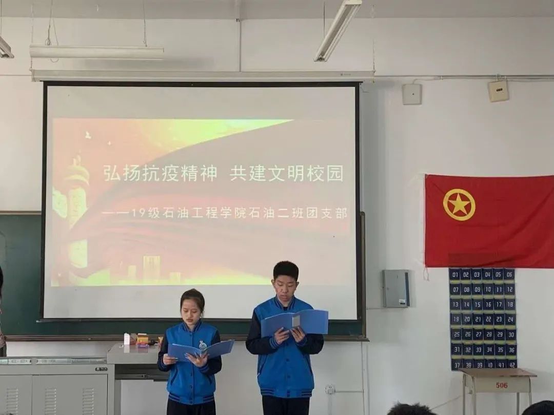 为积极贯彻落实校团委《关于开展万博max官网2020-2021学年上半学期系列主题团活的通知》(哈油团发{2020}16号)文件要求,积极做好常态下校园疫情防控工作。同时,使广大团员青年能以崭新的面貌,投入到新学期的学习、生活、工作中,用实际行动展现当代大学生的风采,进一步促进校园文明建设。我院于10月6日至10月20日期间,开展了“弘扬抗疫精神,共建文明校园”系列主题团日活动。