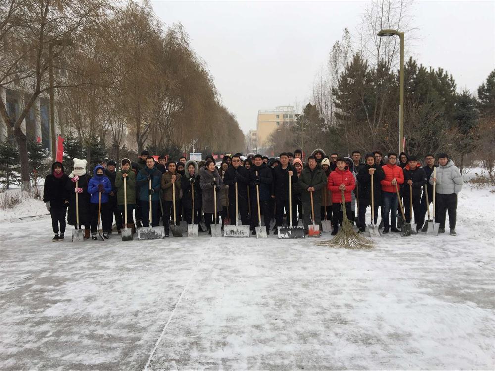 11月30日,纷纷扬扬的大雪弥漫了整个哈石油校园。为保障全校师生的出行安全,积极响应学校“以雪为令”的清雪号召。我院于30日下午1点30分,组织全体教师及学生党员对图书馆前的清雪分担区进行了彻底的清扫。