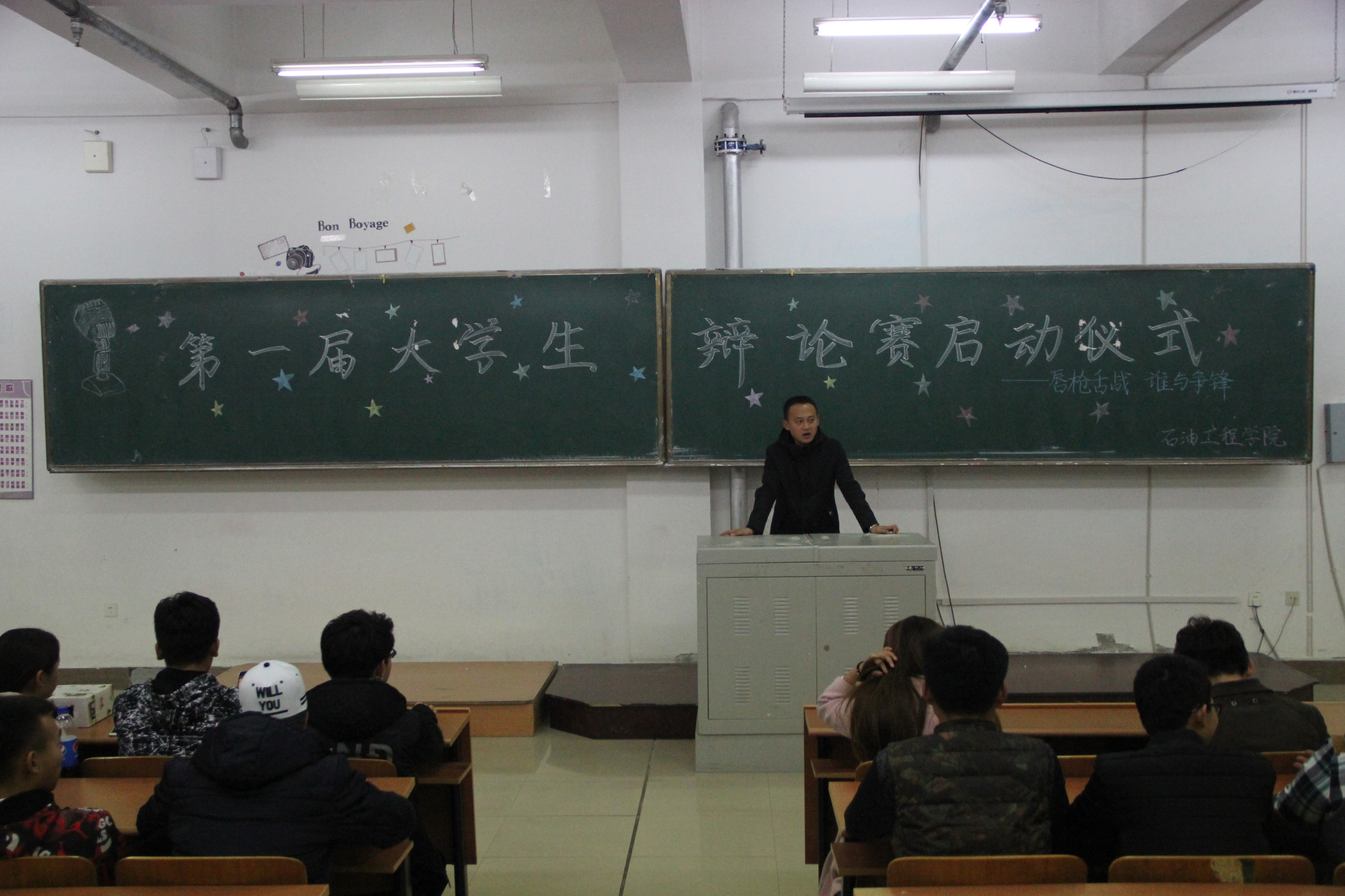 为积极响应本届科学文化艺术节绽放青春主题,丰富学生课余文化生活,石油工程学院拟在本届科技文化艺术节期间,举办第一届“唇枪舌剑,谁与争锋”大学生辩论赛。10月25日晚18点,院学生会、艺术团在主教502教室举行“唇枪舌剑,谁与争锋”大学生辩论赛启动仪式。院团总支副书记王月担任本次活动评委,启动仪式由艺术团主持人队队长李昊东主持。学院各辩论队选手参加了本次启动仪式。