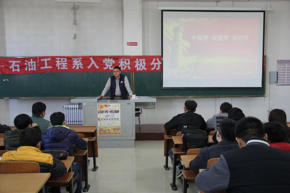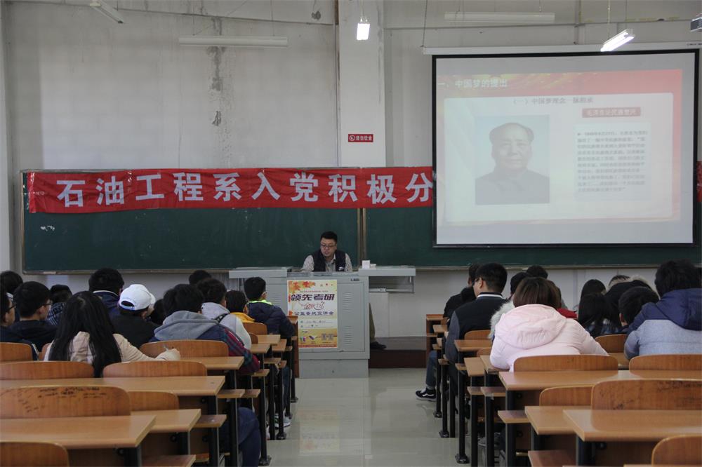 10月24日中午11点50分,石油工程学院入党积极分子培训班党课在主教427教室正式开课。来自石油工程学院各60余名思想积极,要求进步的优秀学生,参加了本次的党课培训班。本次党课由我院党总支副书记康平军主讲。