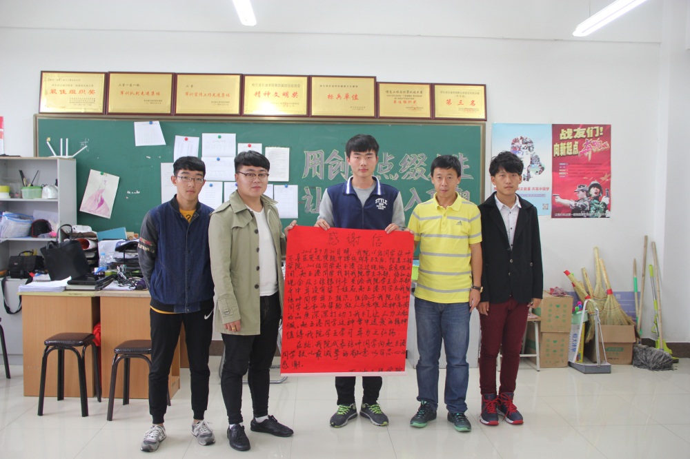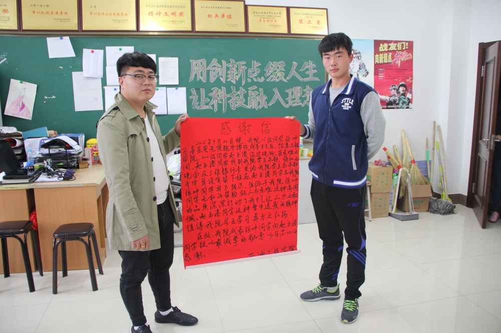 为感谢赵玉港同学这种乐于助人,奉献爱心的高尚品德,27日下午,院学生会主席程海瑶与受伤同学的室友一起来到信息工程学院学工办,专程向赵玉港同学送交了感谢信,并当面表达谢意。