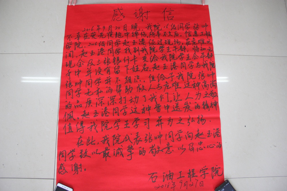 在此,石油工程学院师生再次向信息工程学院赵玉港同学表示衷心的感谢并致以崇高的敬意!
