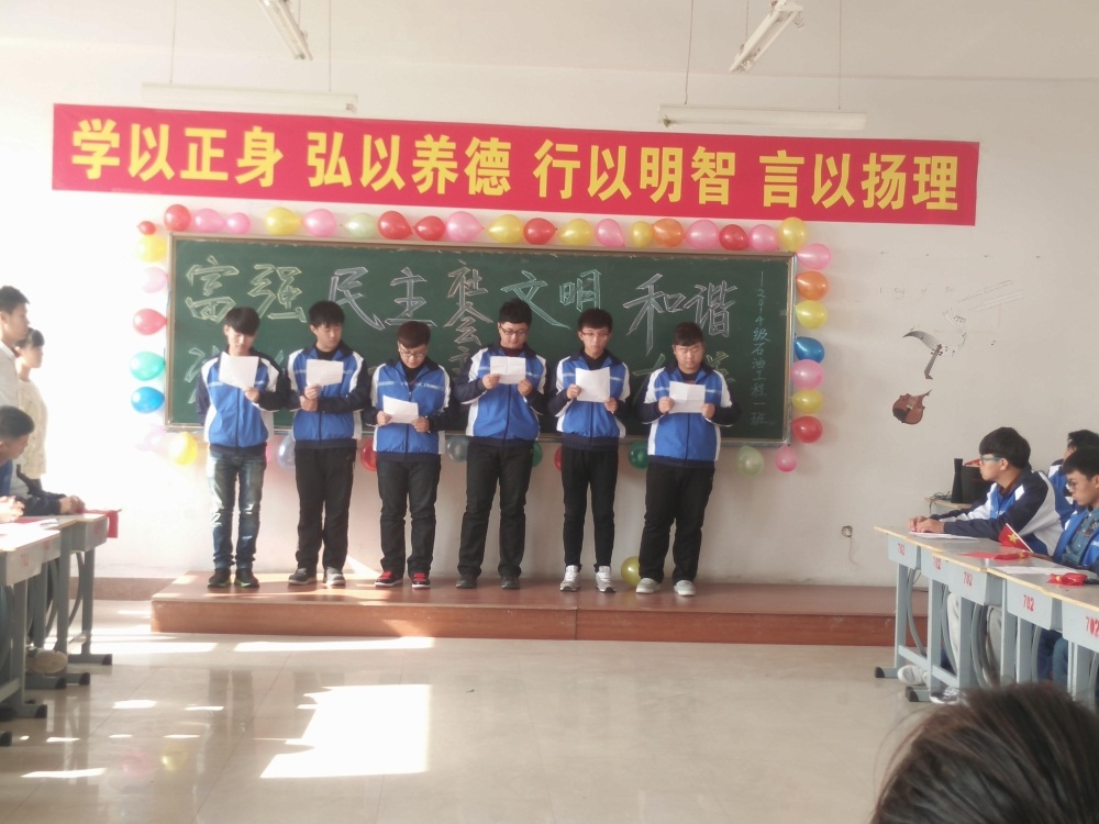 大学生是社会中最积极、最活跃、最有生气的力量。为了给同学们注入一股新的能量,树立文明风尚。引导同学直面青春,志存高远,增长知识,锤炼意志。10月以来,石油工程系开展了一系列以核心主义价值观为主题的活动,2014级各班团活大赛就是其中一项。各班分别用自己的方式诠释核心主义价值观24字,形式多样,内容新颖,充分表达了同学们的爱国之情,立志成为有理想、有抱负的社会主义青年的决心。石油工程系党总支副书记孙金莹,团总支书记康平军及2014级辅导员邱晨明分别参加了此次主题团活。