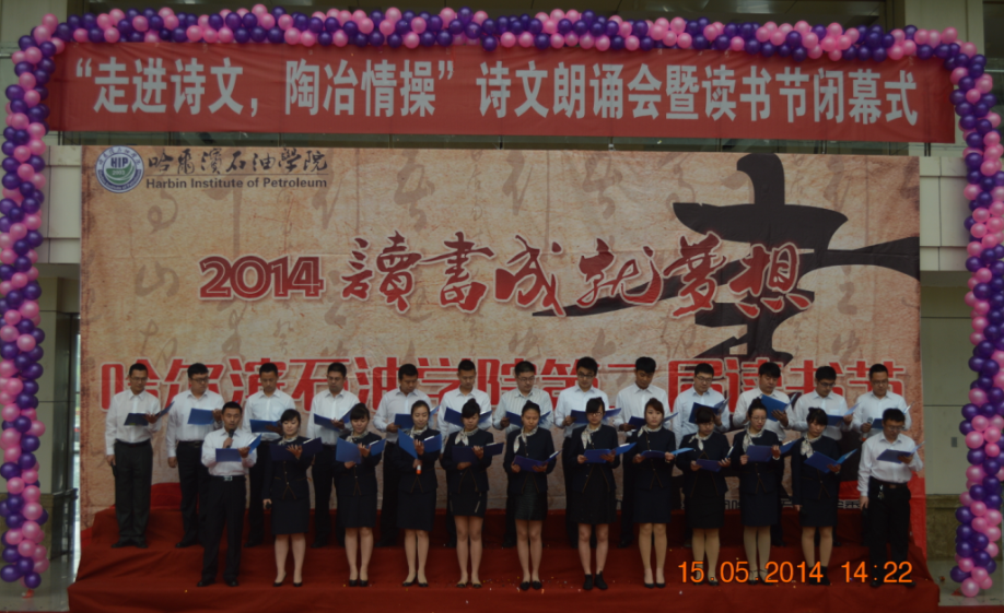 5月15日中午,由院团委举办,石油工程系承办的“走进诗文,陶冶情操”诗文朗诵会暨第二届读书节闭幕式在阳光大厅成功举行。学院各部门领导出席了本次活动并担任评委,各学团组织参加了本次大会。