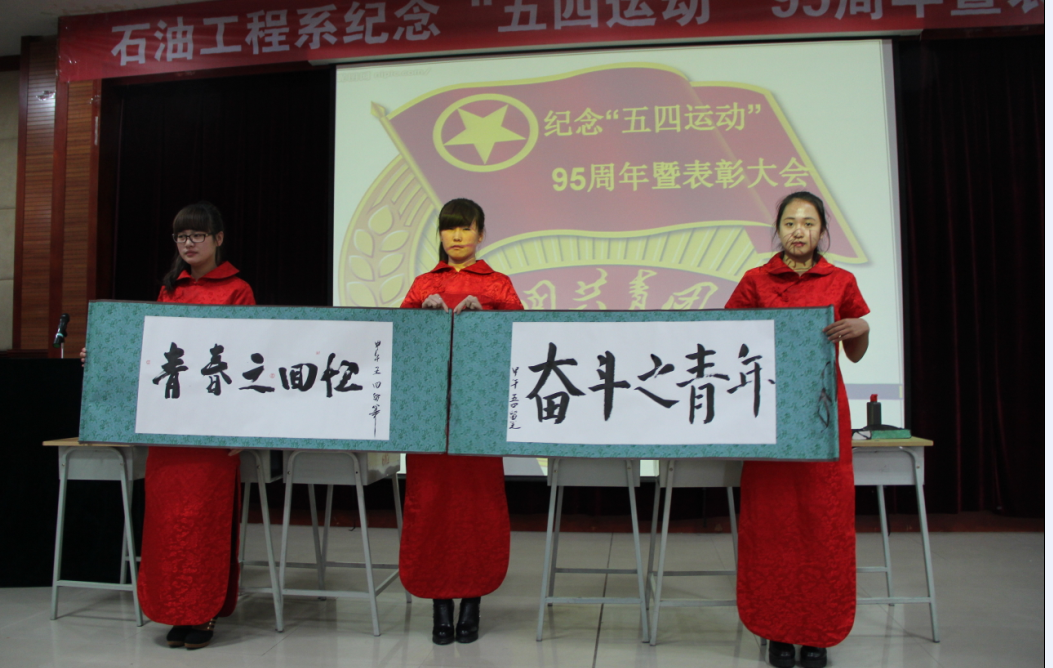 会议开始,全体师生共唱团歌庆祝“五四青年节”。主持人为同学们介绍了五四运动,一幅幅陈旧的相片再现了当年战火纷飞的岁月里,青年学子保家卫国,驱除鞑虏的爱国热情。我系孙洋、王博两名同学现场书写了“奋斗之青年”、“青春之回忆”两幅大字纪念五四运动95周年。