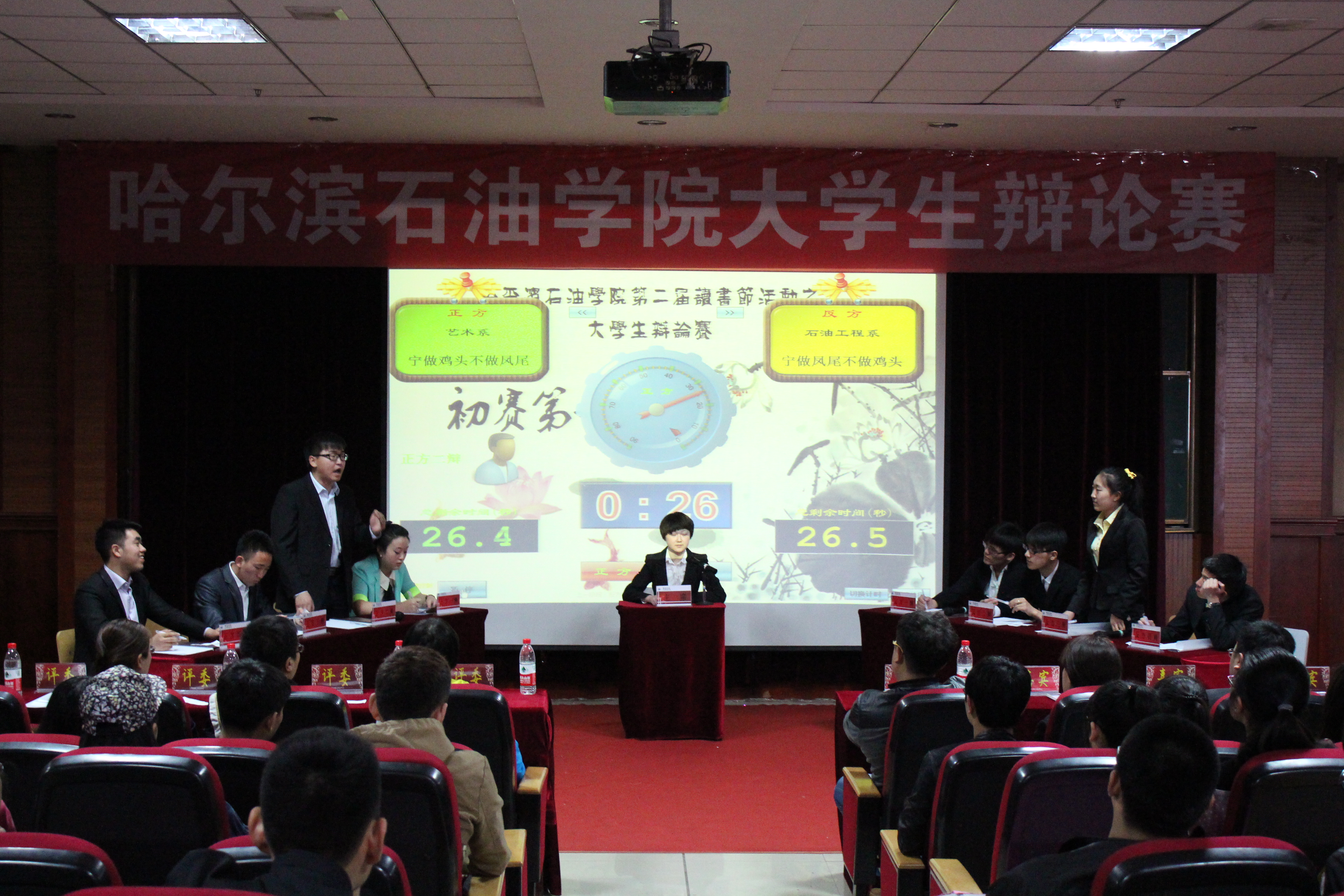 本场比赛的烽火由石油系与艺术系点燃,双方就“宁做鸡头,不做凤尾”和“宁做凤尾,不做鸡头”展开交锋。辩论分为立论陈词、互相攻辩、自由辩论、总结陈词四个环节,双方辩手唇枪舌剑,针锋相对、步步紧逼。他们清晰的思路和巧妙的陈词给现场的观众们留下了深刻的印象。在近一个小时的激烈辩论中,观众们掌声不断,高潮迭起,妙语连珠。思政部冯博老师在辩论之后对本场比赛进行了客观公正的点评,分别指出了双方的优点和不足,并表示期待大家在接下来的辩论比赛中有更出色的表现。