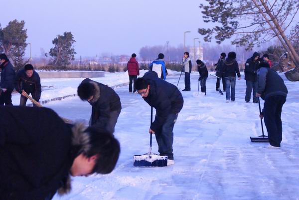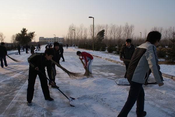 2009年3月5日,大庆石油学院华瑞学院主楼前面的广场上忙碌着一批“全副武装”的学生,他们挥舞着雪锹和扫帚,一片片的积雪顷刻间变成了一座座雪堆,他们就是石油工程系08级全体新生.