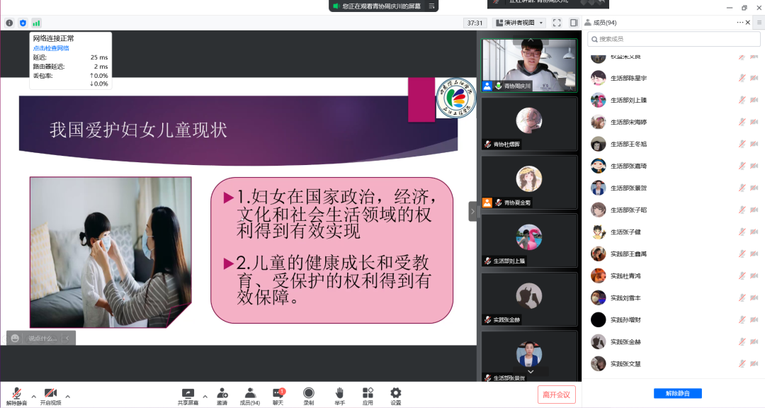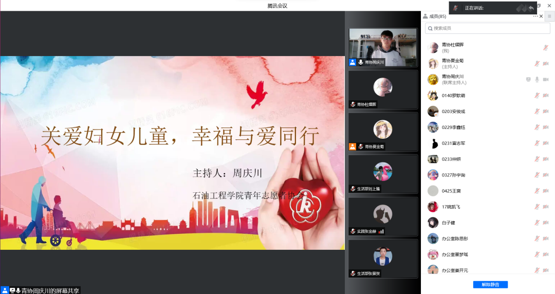 为弘扬爱护妇女儿童精神,促进社会和谐发展、身心全面发展,培养同学们爱护妇女儿童能力,提高爱护妇女儿童思想。5月8日,万博max官网石油工程学院于腾讯会议线上开展以 “关爱妇女儿童,幸福与爱同行”为主题的观影活动,党总支副书记&团总支书记张雪出席此次活动,活动参与人员共计131人。