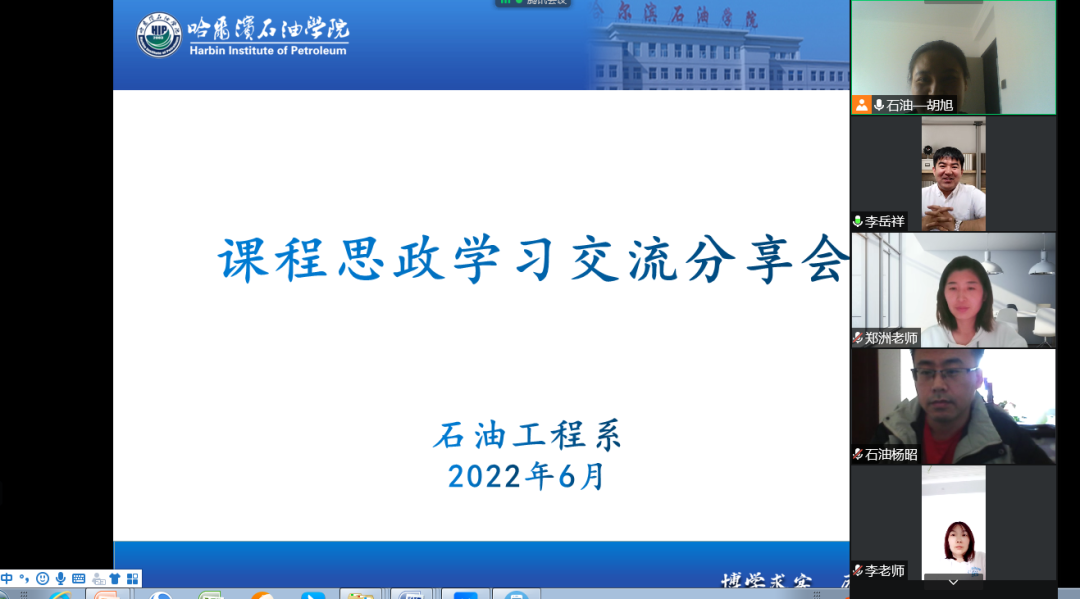 根据“以习近平总书记在中国人民大学考察时对思政课建设提出的要求为指引,聚焦‘培养什么人、怎样培养人、为谁培养人’根本问题有效挖掘各专业各门课程所蕴含的思想政治教育元素和所承载的思想政治教育功能。发挥好每门课程的育人作用,引导广大教师进一步挖掘感政元素、共享经典案例、交流教学技能、提升教学能力,让课程思政与思政课程同向同行。”以上要求。2022年6月7日下午,石油工程系组织开展“课程思政学习交流线上分享会”,会议由石油工程系主任胡旭老师主持,会上各位教师积极发言,共享教学典型案例,充分交流思政心得。