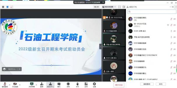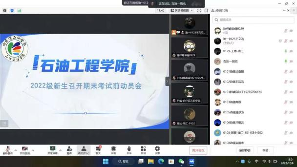 会上首先,石油工程系年级主任胡旭从学风、纪律、规划三个方面对2022级学生接下来的学习生活做了要求。胡旭指出,临近学期末,希望同学们认真复习,积极备战期末考试,取得优异的成绩;为确保规范公平,防范作弊,强调线上考试采用“双机位”模式进行,即一个机位从考生正面拍摄,一个机位从考生侧后方45度拍摄;他勉励学生要珍惜大学时光,努力提升自己,以平和、阳光的心态度过大学生活。