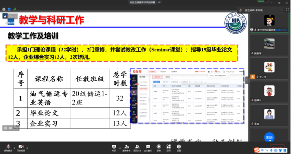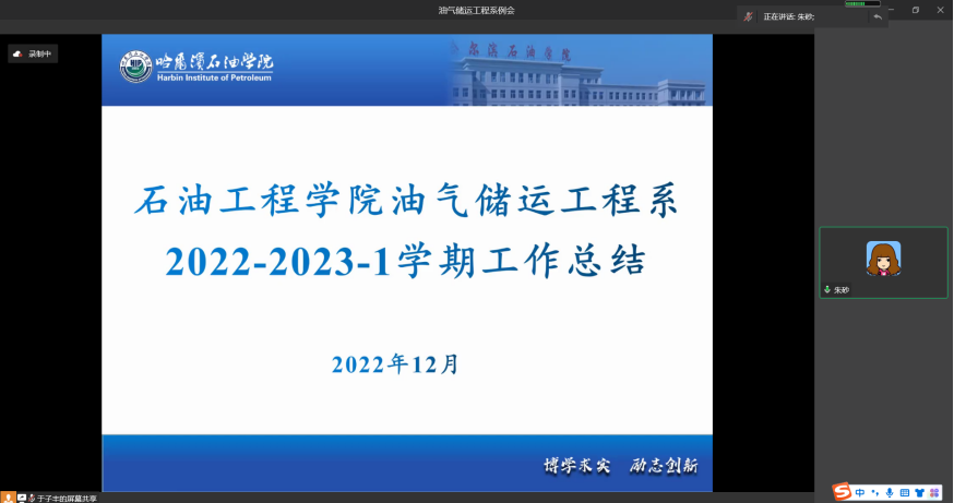 时光飞逝,转眼间期末悄然而至,在本学期的工作即将接近尾声之时,为进一步提高教学质量,加强教学管理,创造良好教育氛围,油气储运工程系于2022年12月13日上午8:20在线上召开了期末工作总结大会,副院长朱砂及油气储运工程系全体教师参会,会议由于子丰主任主持。